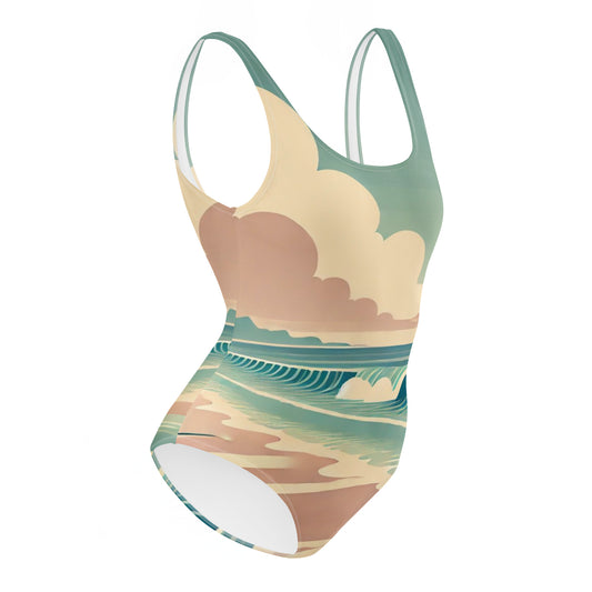 Abstract Ocean Wave Swimsuit – Women's All-Over Print Beach Scene One-Piece, Coastal Retro Design