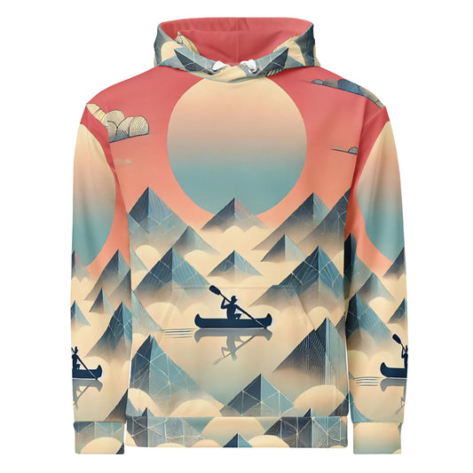Mountain Sunrise Unisex Hoodie – Abstract Landscape Art with Canoe Scene, All-Over Print, Nature Art Pullover,,