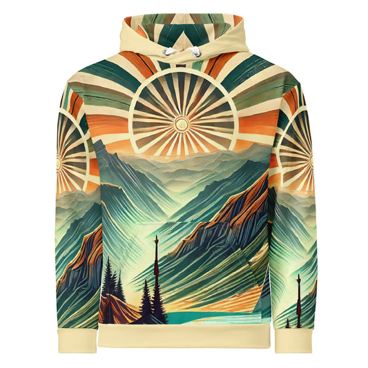 Mountain Sunrise Art Graphic Hoodie Unisex Pullover Abstract Landscape Design Multicolor
