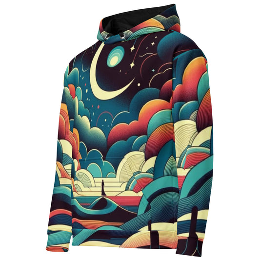 Eclipse Over Ocean Hoodie – Unisex All-Over Print Abstract Graphic Pullover, Cosmic Landscape Design