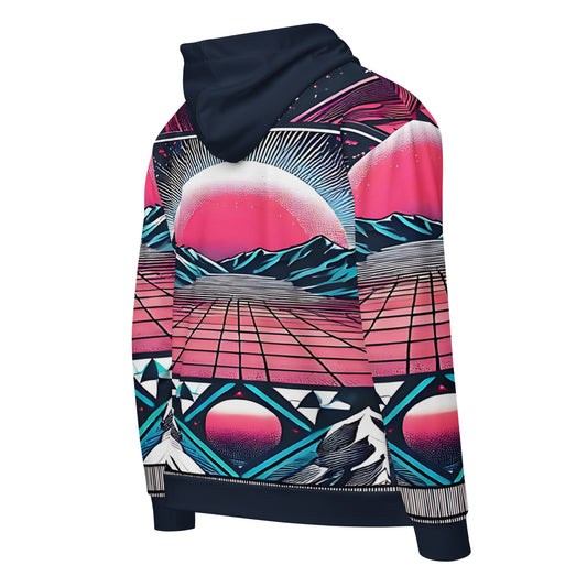 Futuristic 80's Neon Mountain Hoodie - Unisex All-Over Print Zip-Up Jacket, Retro Abstract Art
