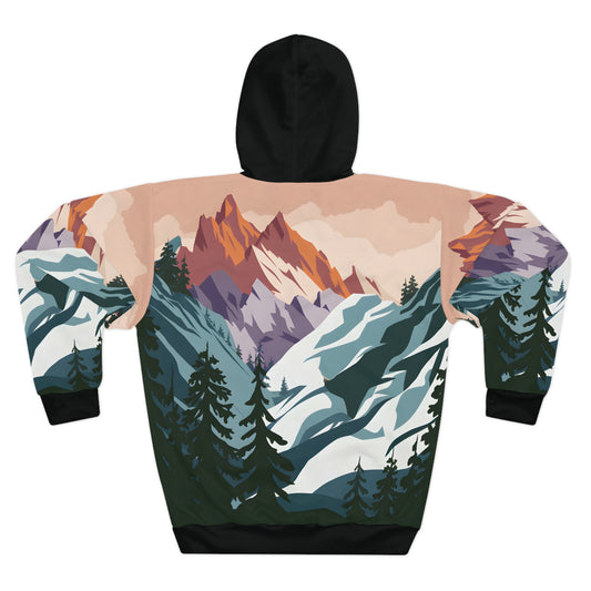 Snow Peaks All Over Print Hoodie Scenic Mountain Outdoor Adventure Apparel