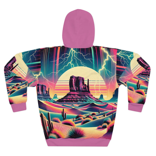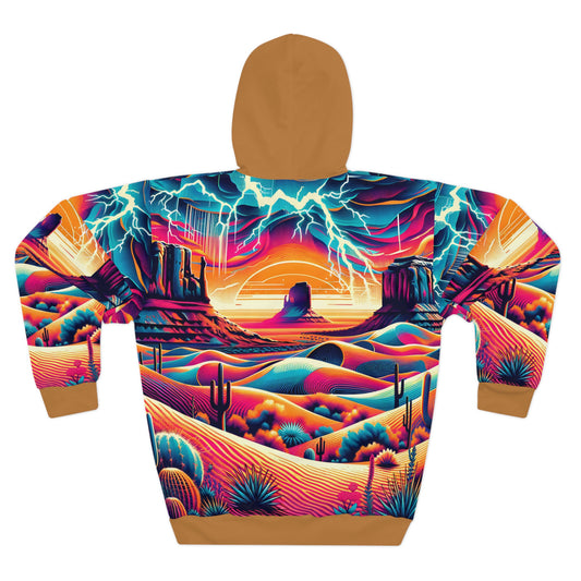Desert-Inspired Hoodie with Psychedelic Sunset and Vibrant Patterns