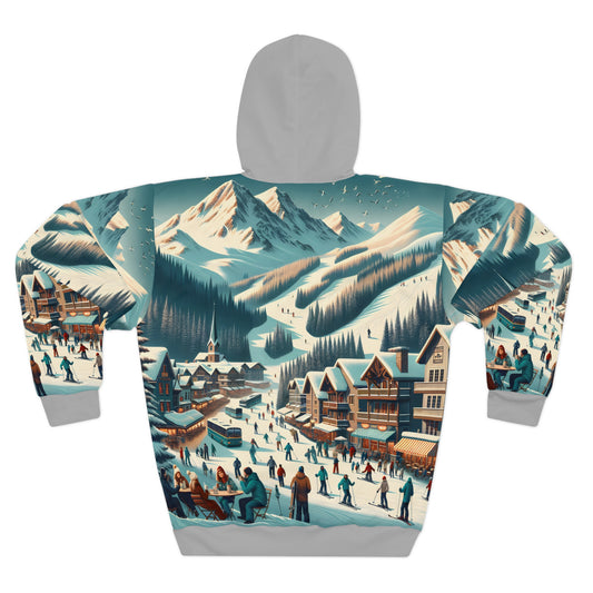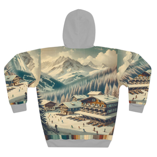 Vintage Ski Town Resort Hoodie with All-Over Mountain Print Design