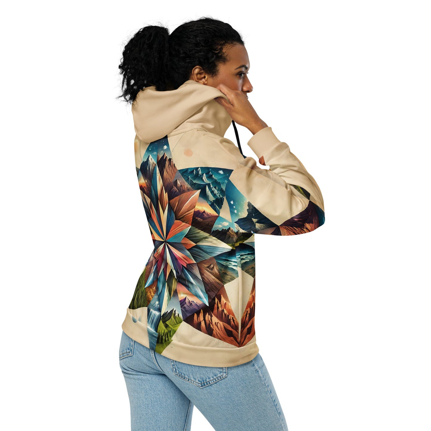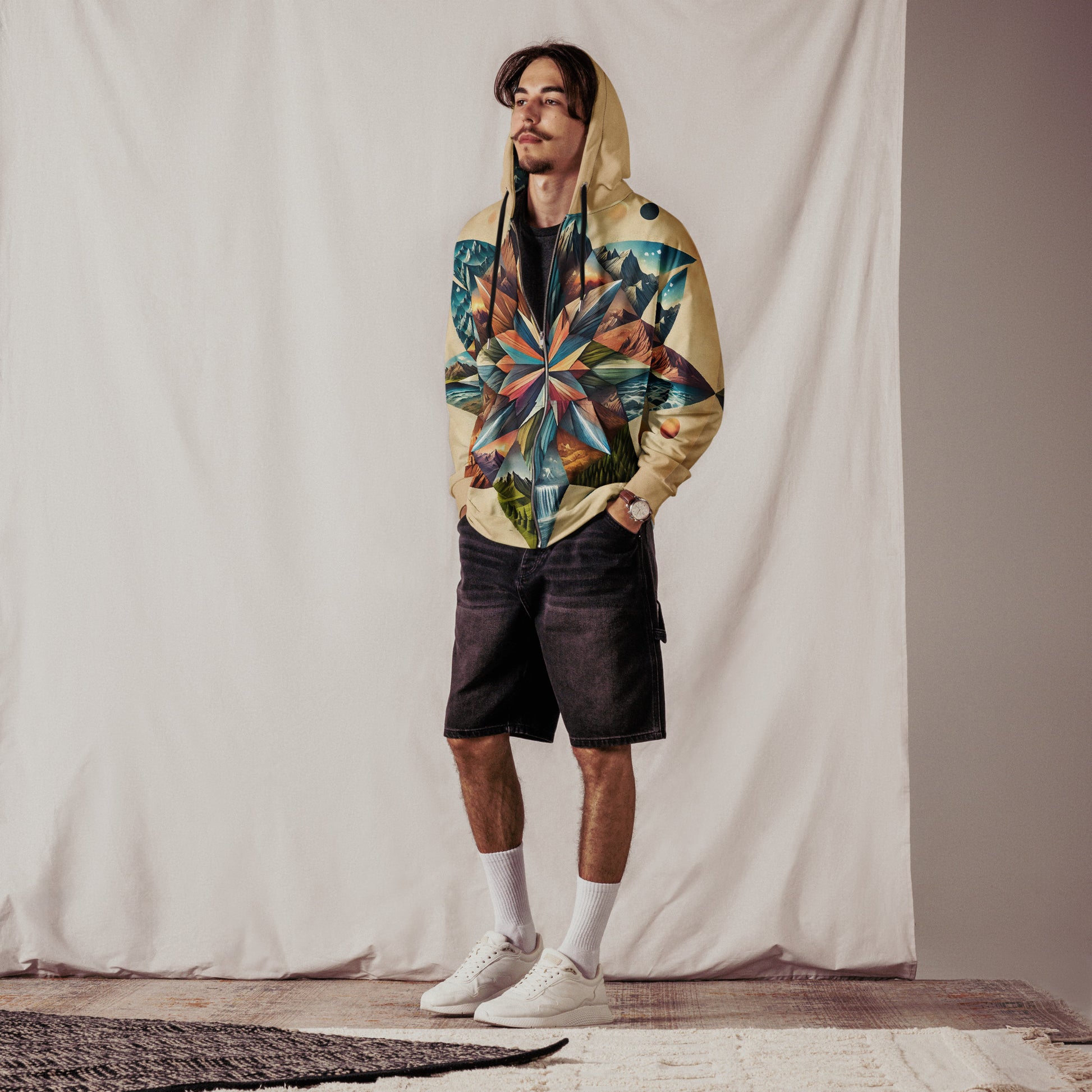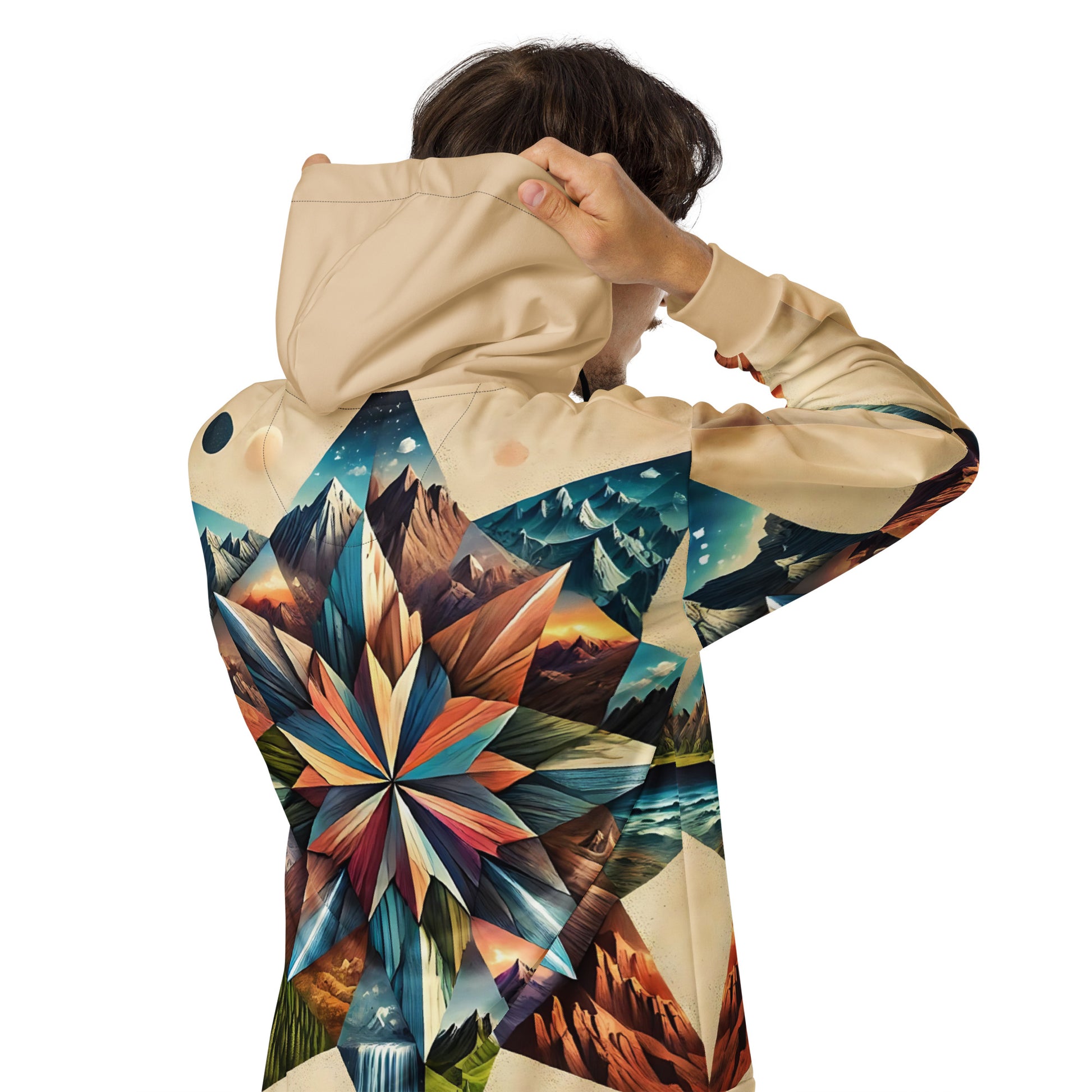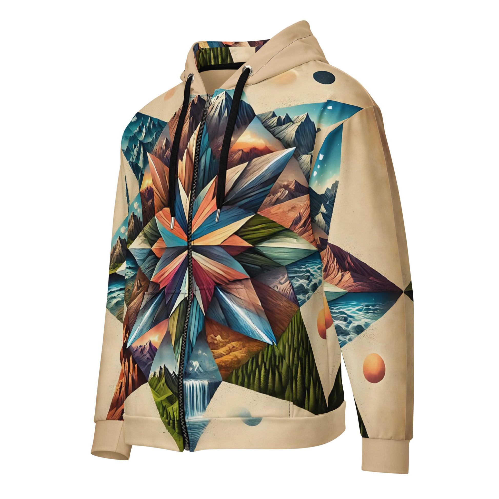 Explore the universe in style with this Abstract Mountain Galaxy Full-Zip Hoodie. Featuring a mesmerizing all-over print that blends stunning mountain landscapes with cosmic elements, this unisex hoodie is perfect for adventure seekers and art lovers alike. The intricate, kaleidoscopic design showcases vibrant colors and geometric patterns, creating a truly unique look. With its comfortable full-zip construction, this hoodie is ideal for everyday wear or as a statement piece for festivals and casual outings.