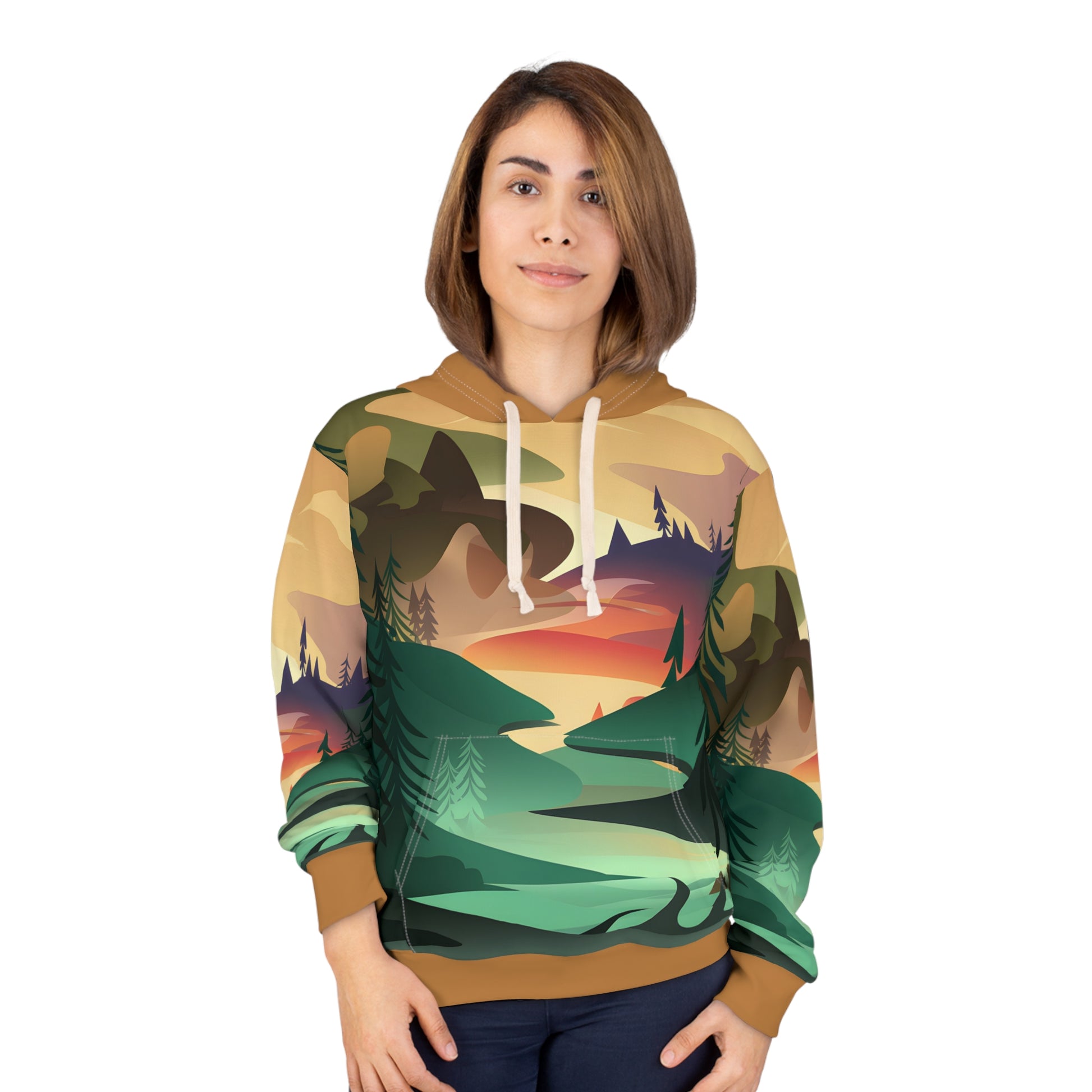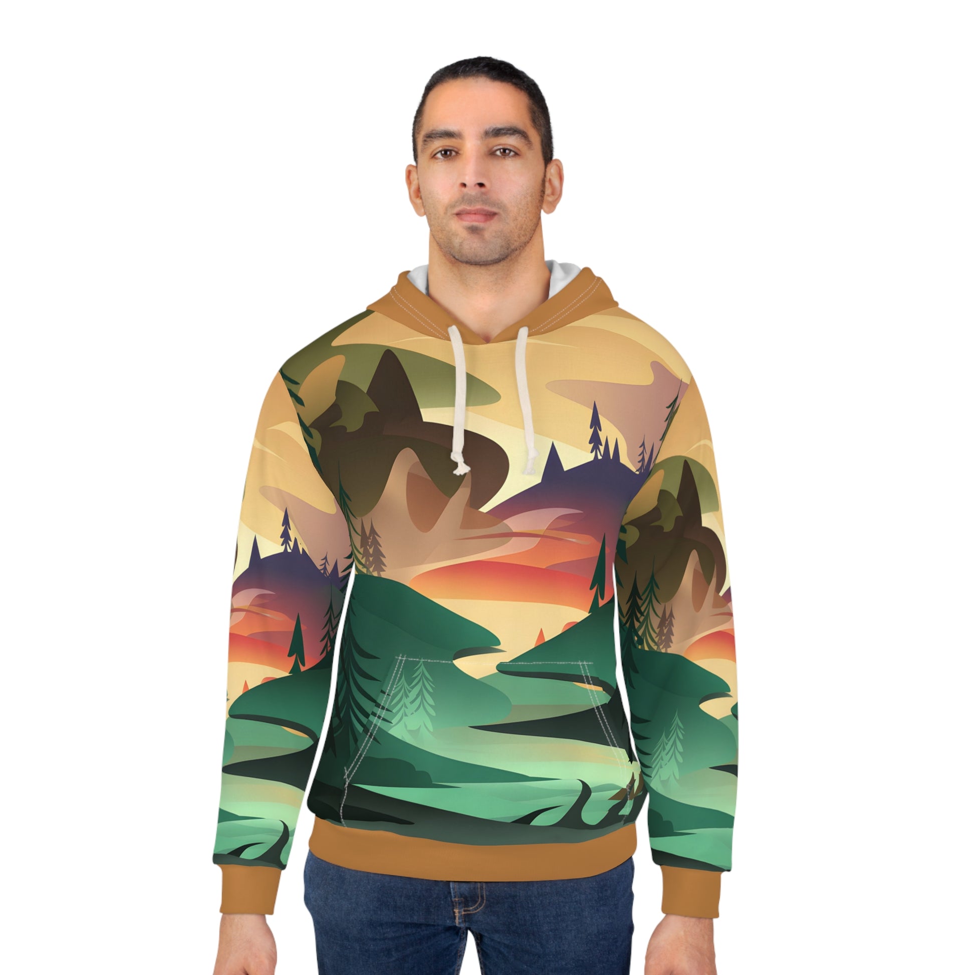Elevate your outdoor adventures with the All Over Print Hoodie in Twilight Embers. This unisex pullover combines comfort and style, featuring a stunning scenic design that ignites your wanderlust. Crafted from soft, breathable fabric, it keeps you cozy while you explore nature's beauty. Perfect for every adventurer!