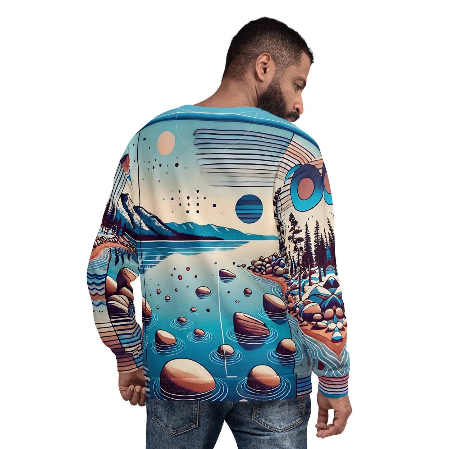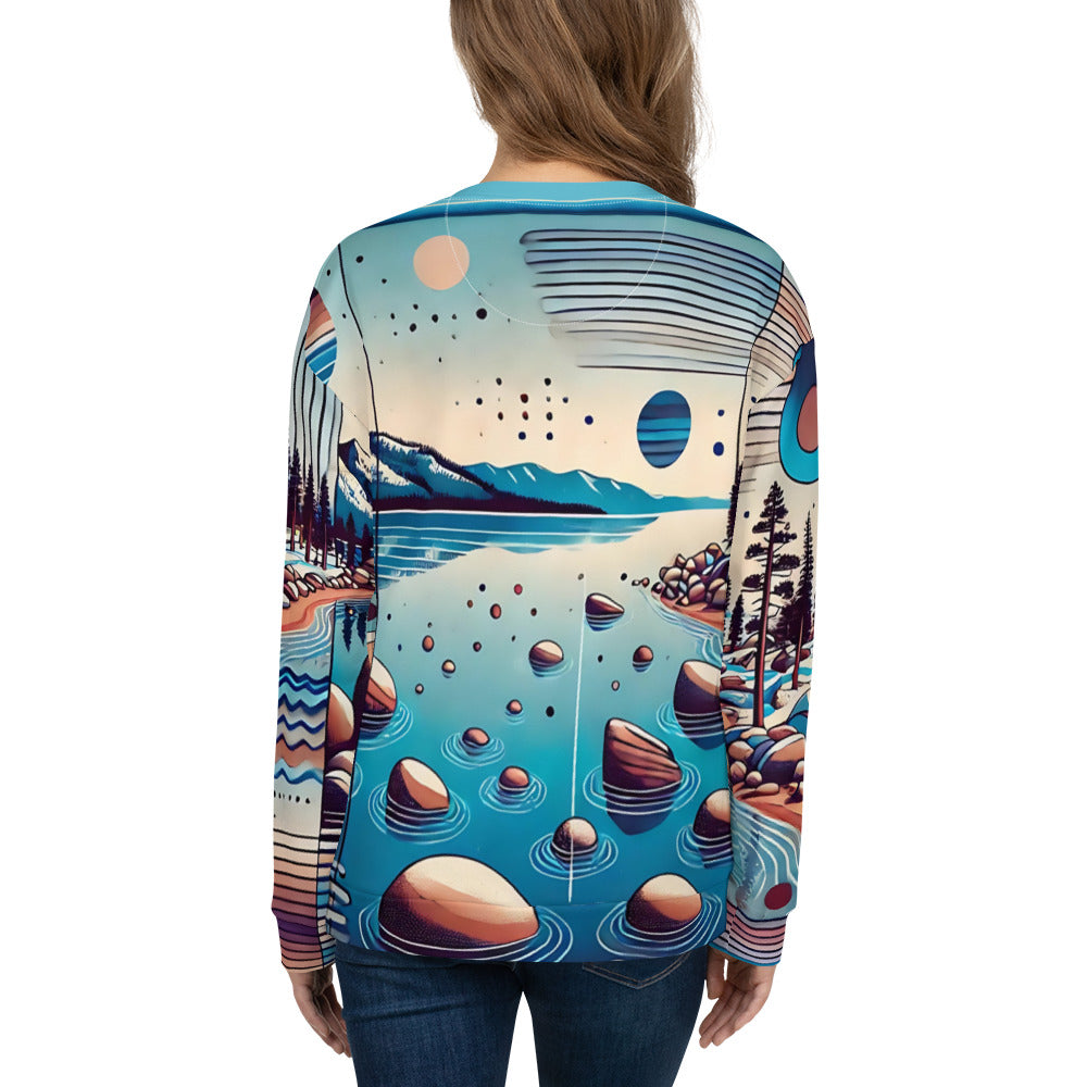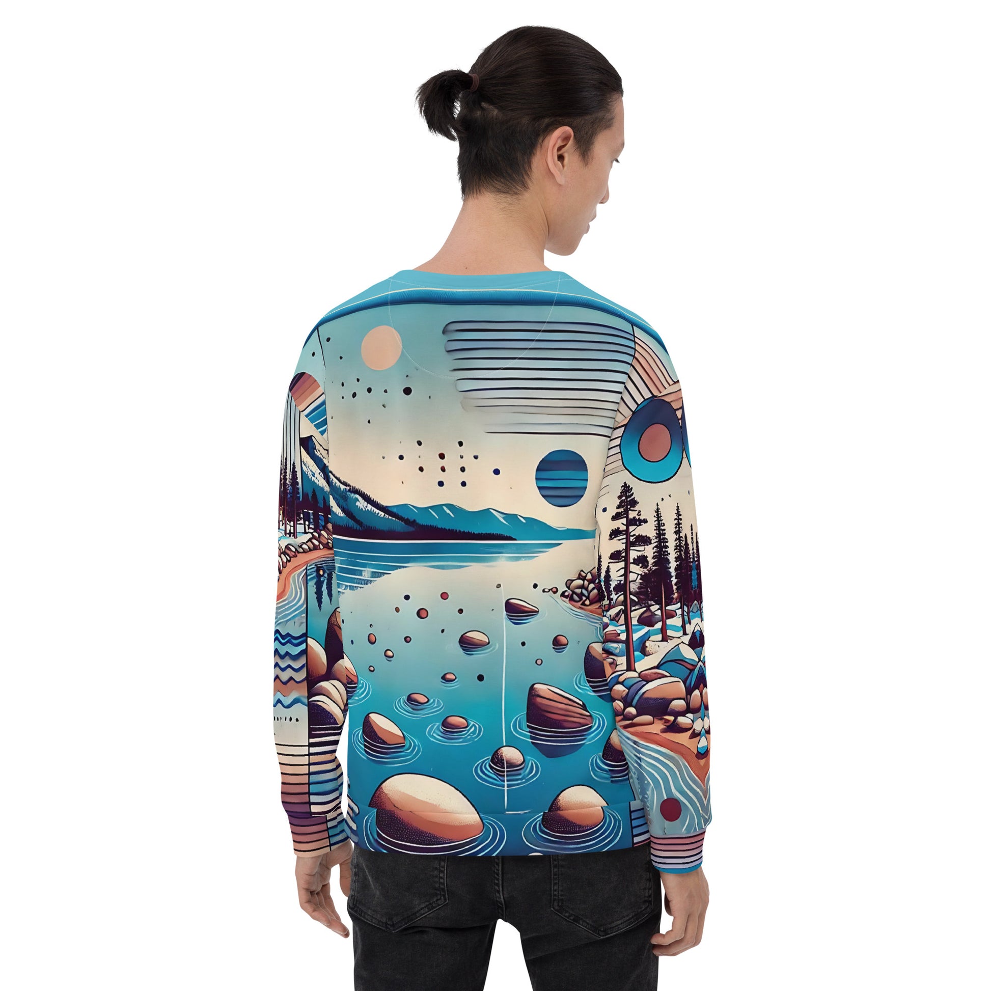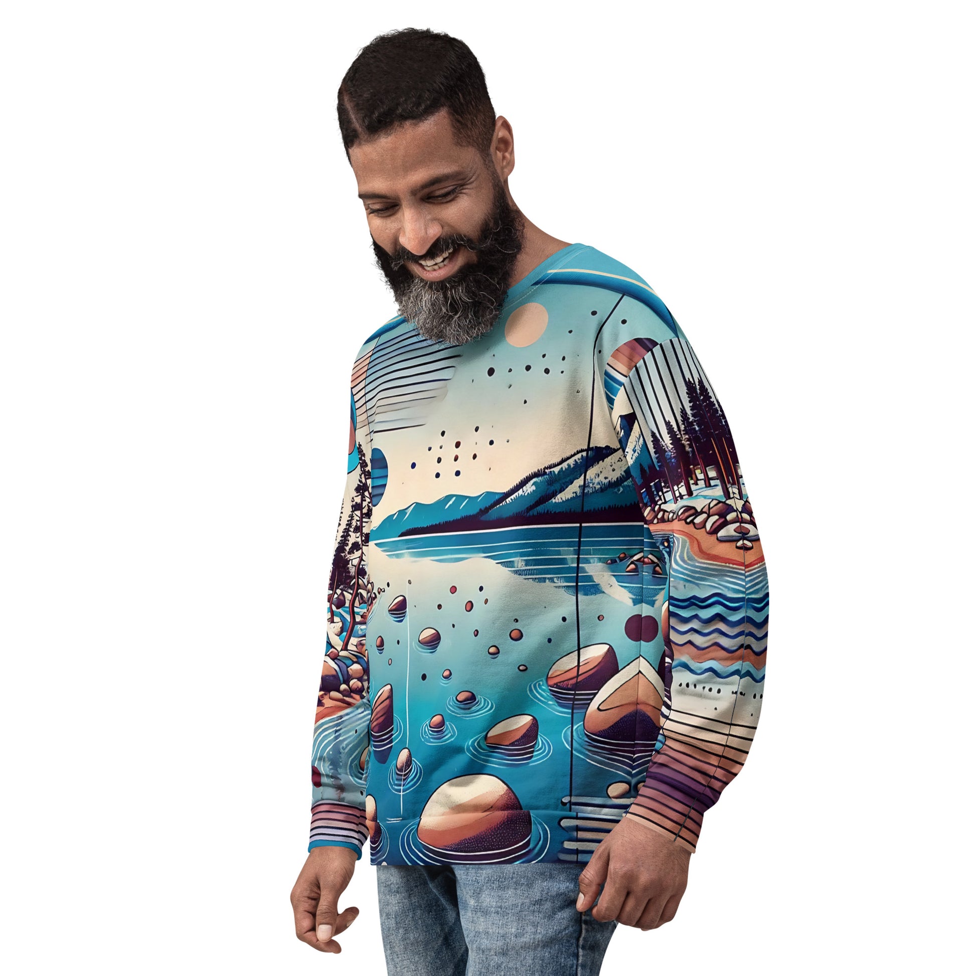 Experience the beauty of Lake Tahoe's iconic Sand Harbor with this stunning all-over print sweatshirt. Designed for those who appreciate nature and art, this sweatshirt showcases the breathtaking round rocks, serene blue waters, and snowy mountain peaks, complemented by abstract, hand-drawn geometric accents in a minimal psychedelic style.