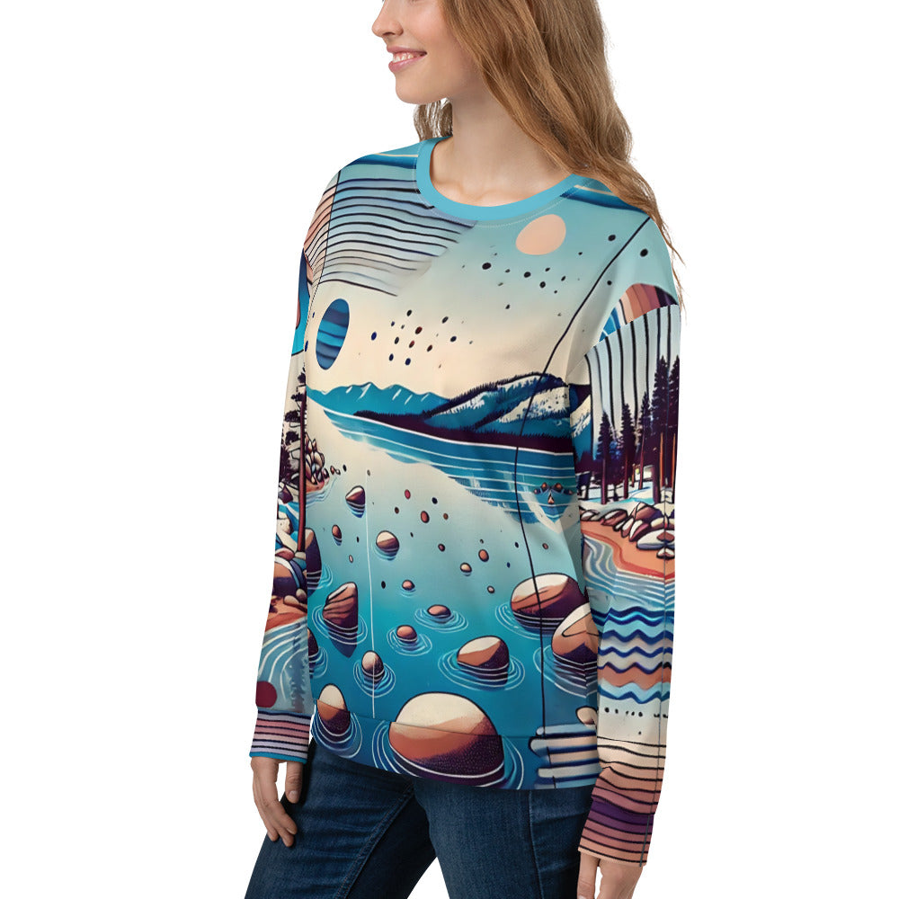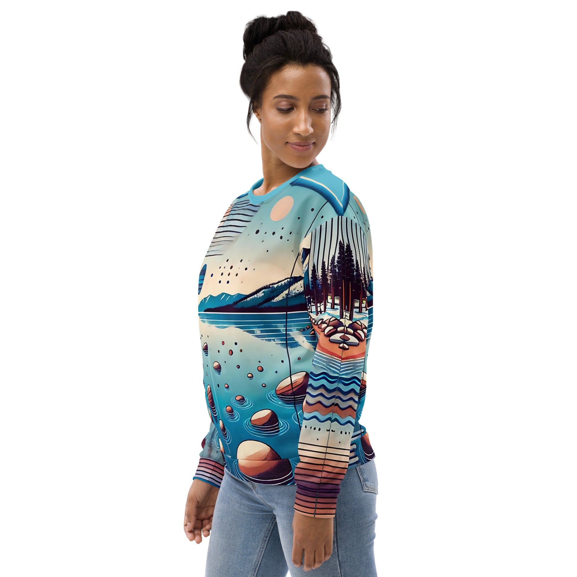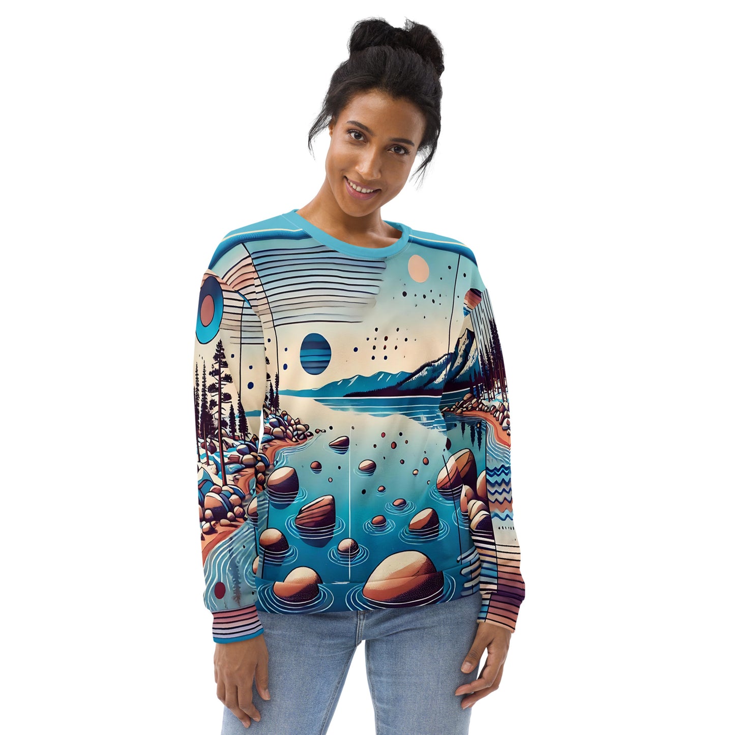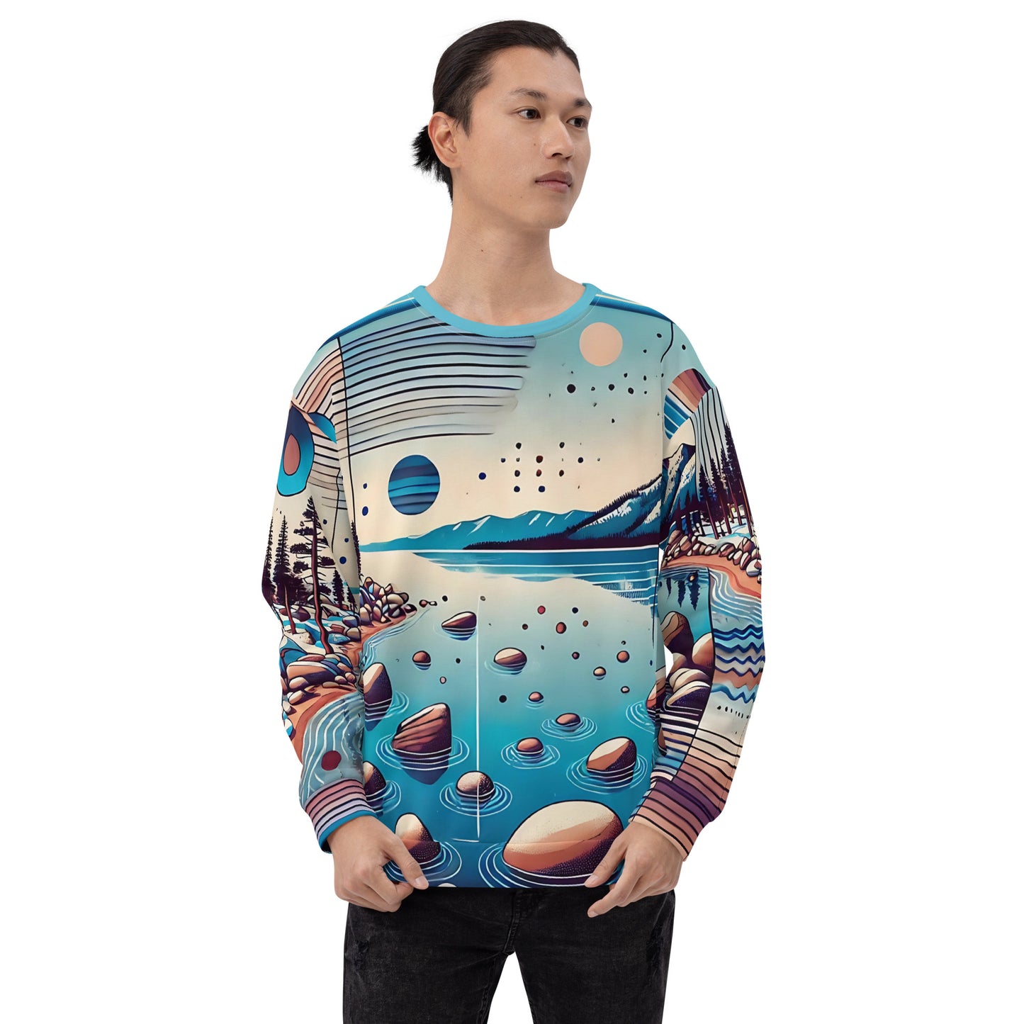 Experience the beauty of Lake Tahoe's iconic Sand Harbor with this stunning all-over print sweatshirt. Designed for those who appreciate nature and art, this sweatshirt showcases the breathtaking round rocks, serene blue waters, and snowy mountain peaks, complemented by abstract, hand-drawn geometric accents in a minimal psychedelic style.