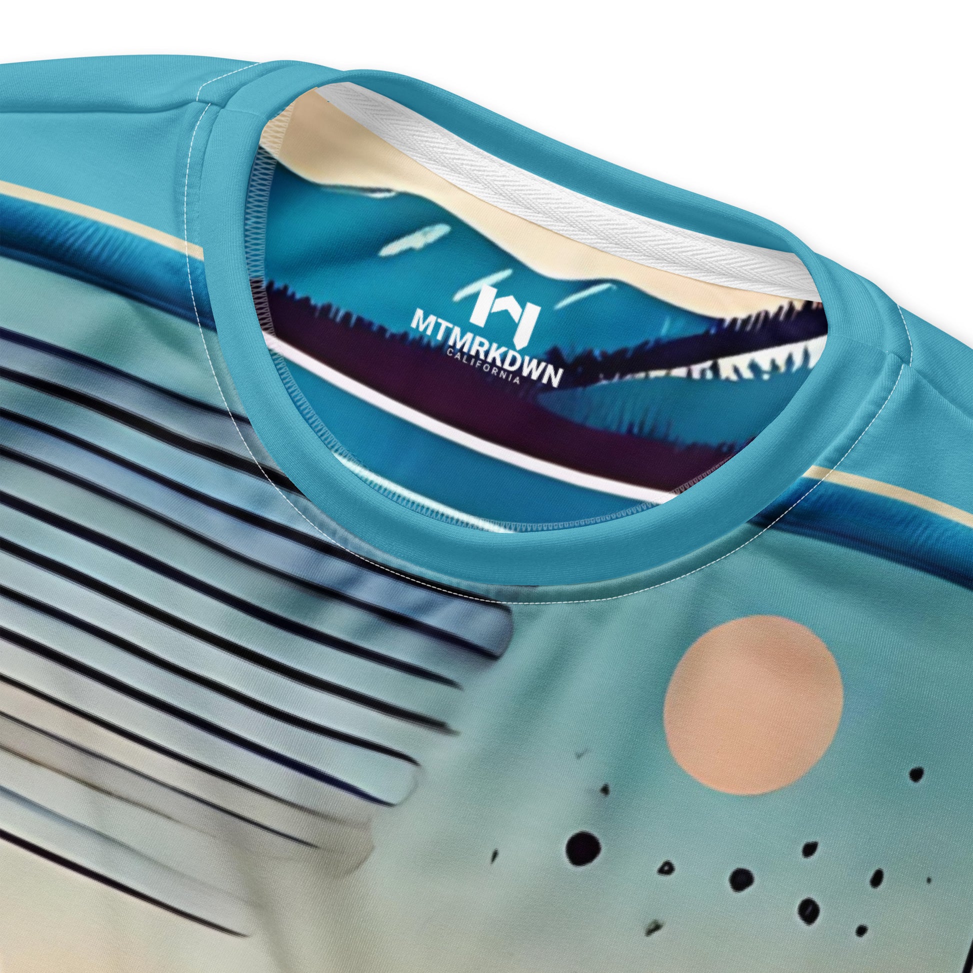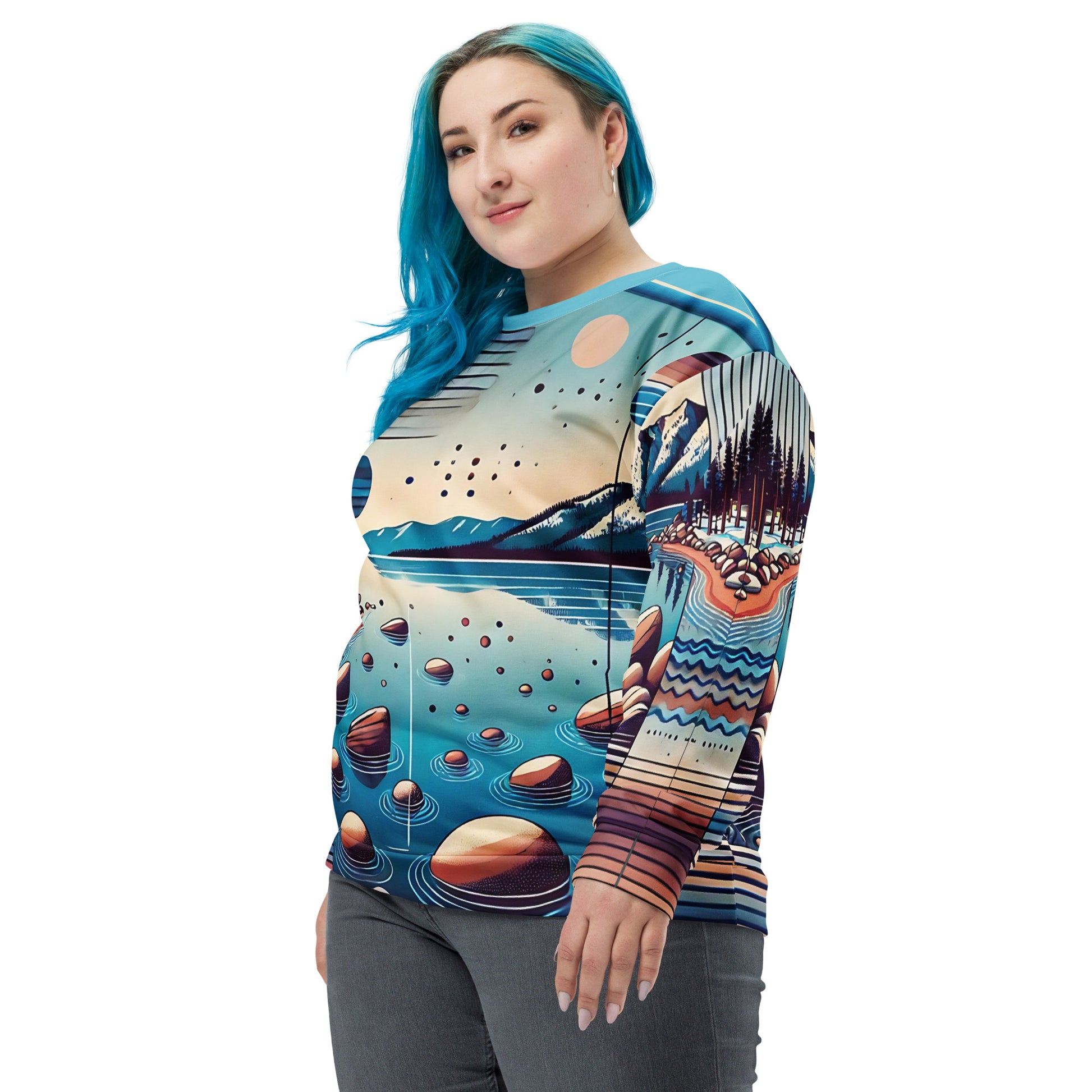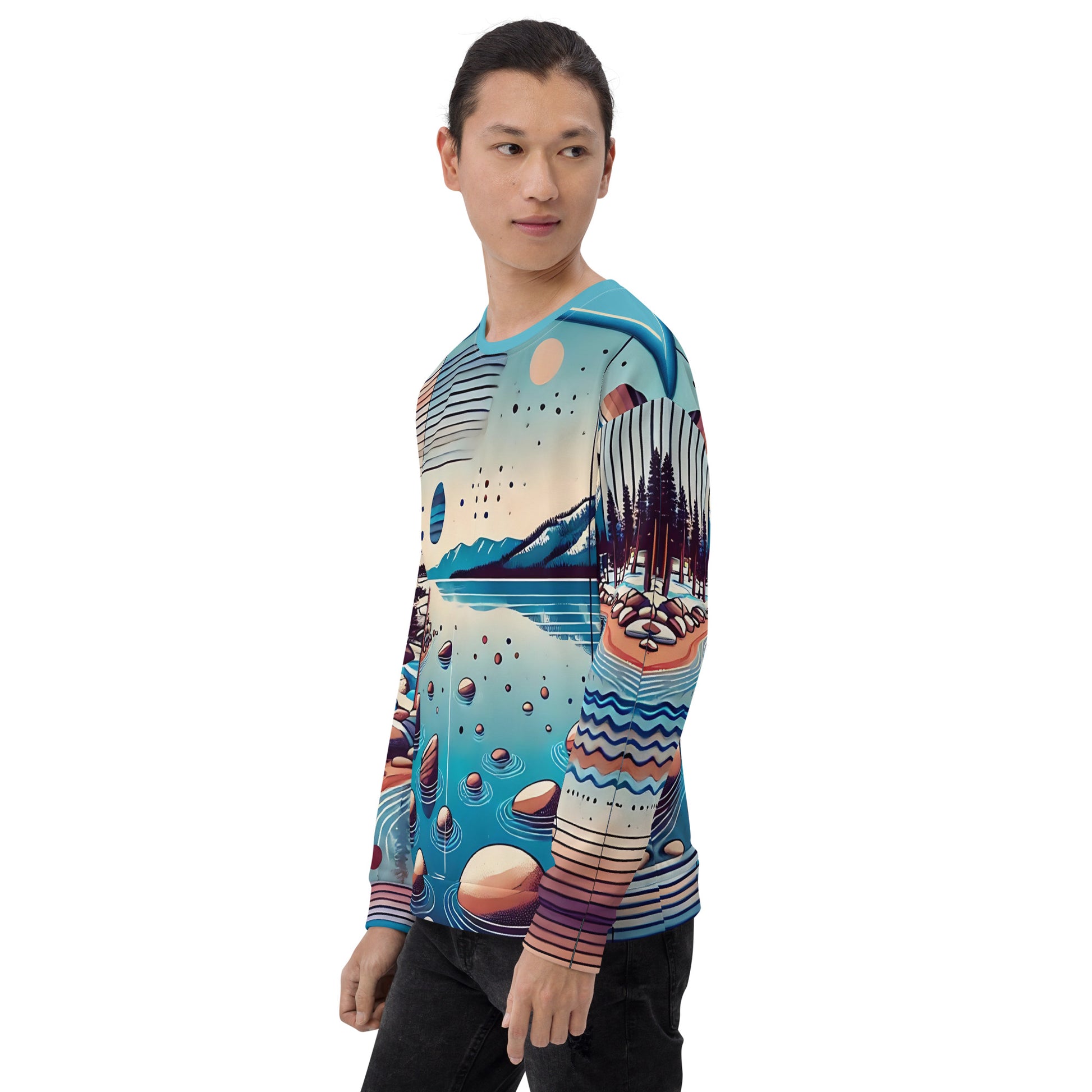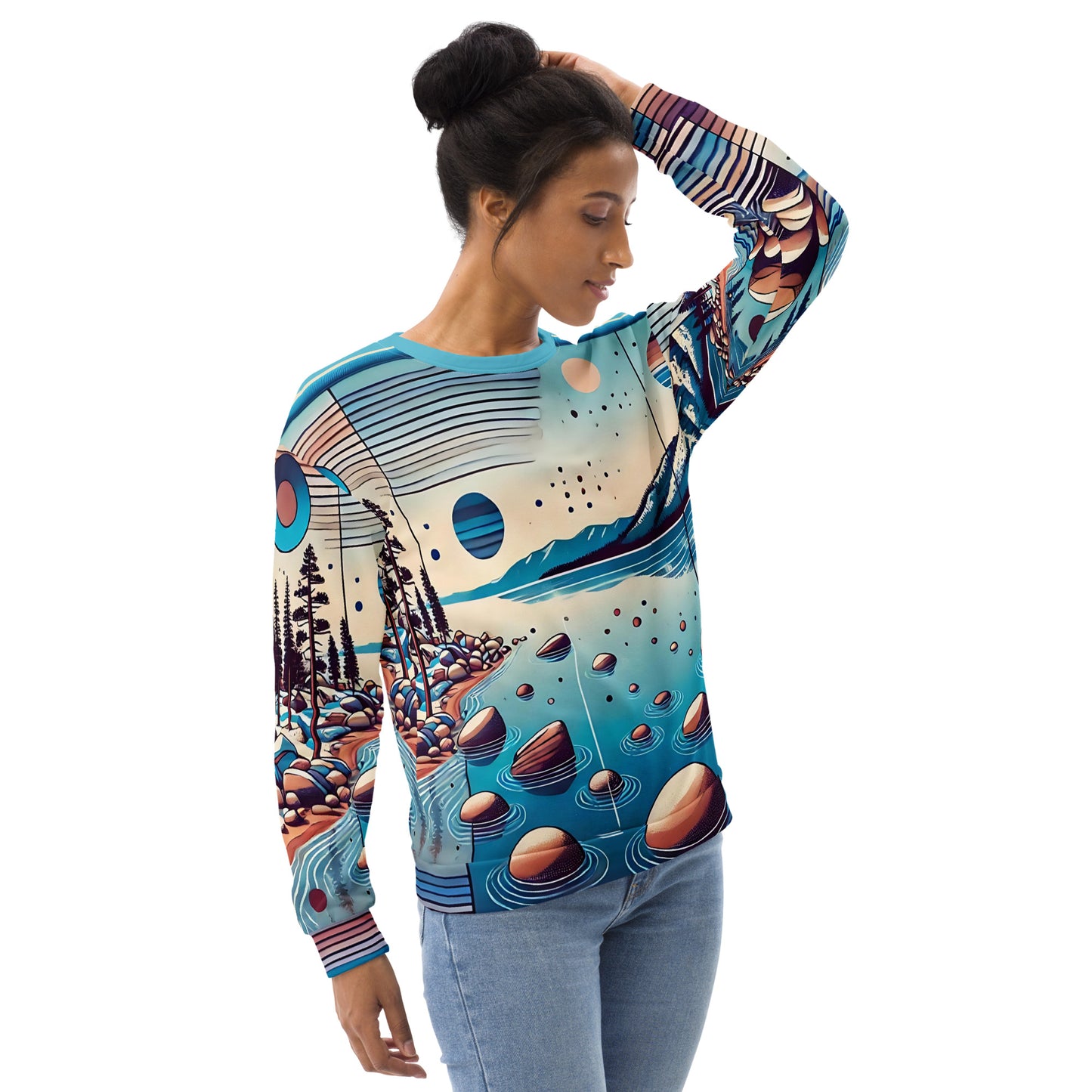 Experience the beauty of Lake Tahoe's iconic Sand Harbor with this stunning all-over print sweatshirt. Designed for those who appreciate nature and art, this sweatshirt showcases the breathtaking round rocks, serene blue waters, and snowy mountain peaks, complemented by abstract, hand-drawn geometric accents in a minimal psychedelic style.