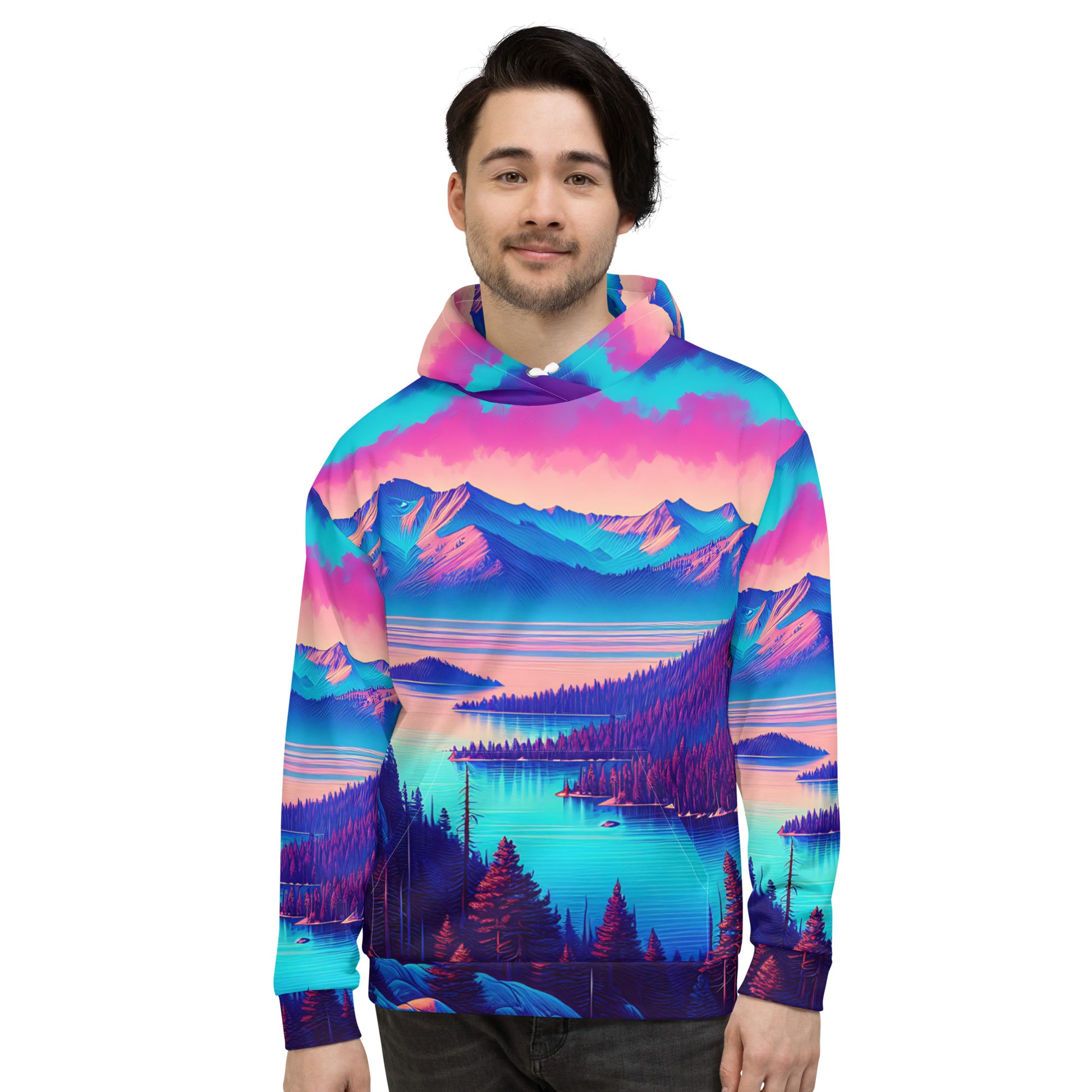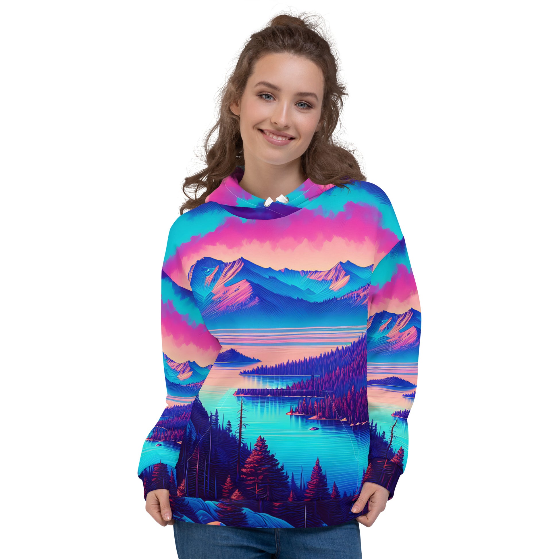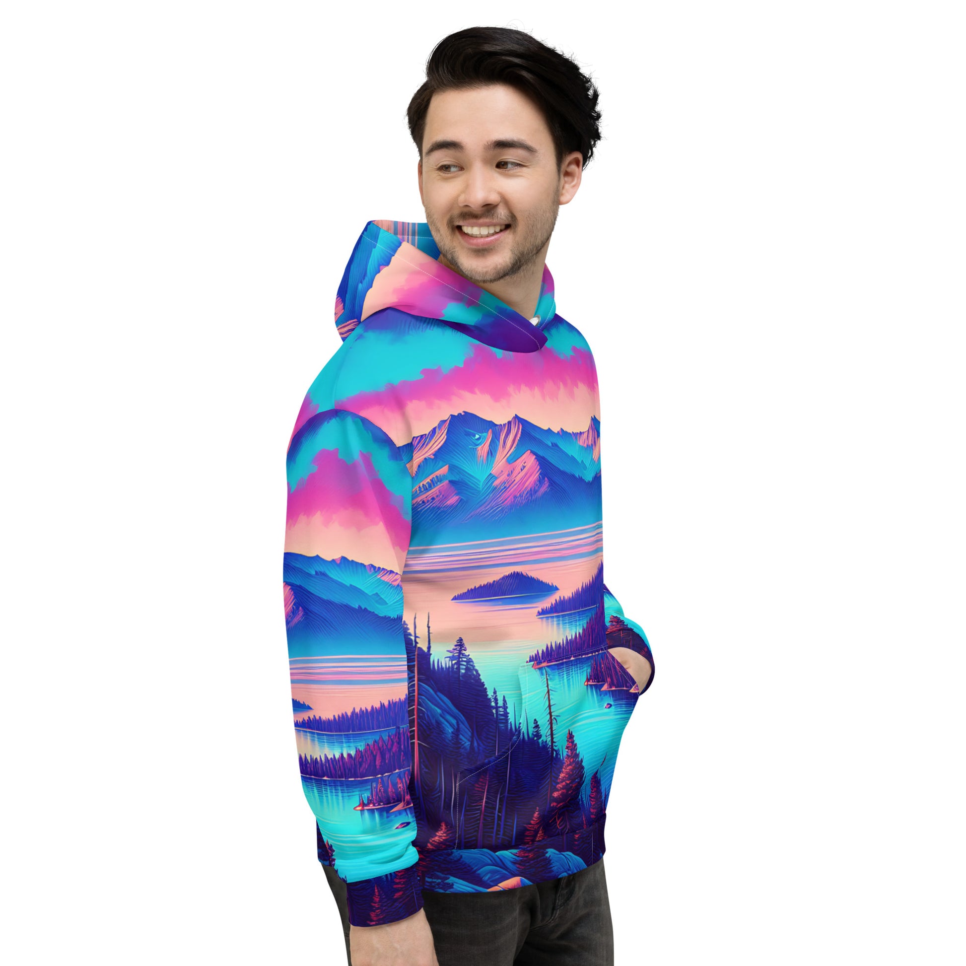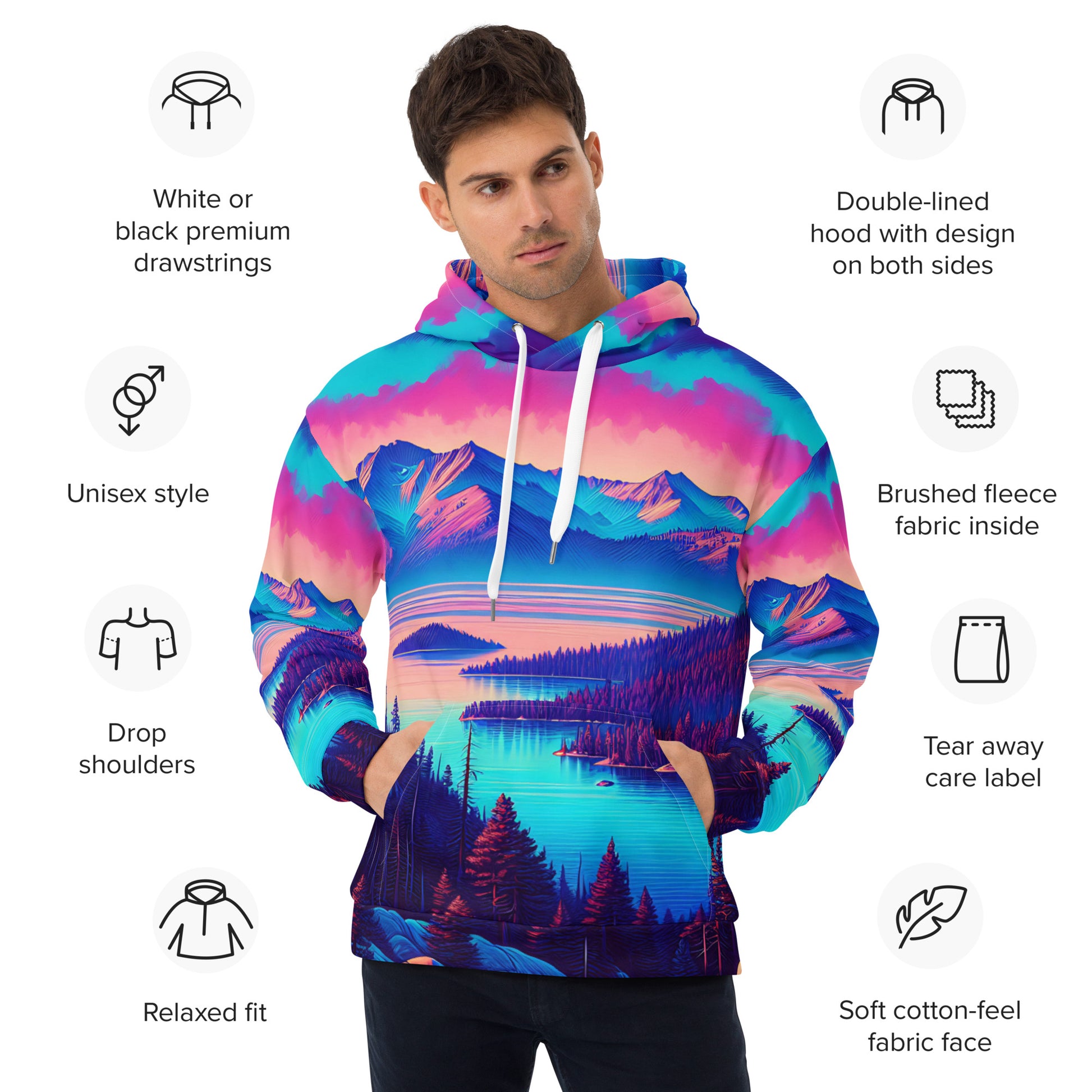 Experience a sartorial escape with this vibrant, mountain landscape graphic hoodie in size Large. The all-over print captures the ethereal beauty of a mountain sunset, with its vivid color palette of pink, blue, and purple hues. This unisex hoodie is as functional as it is visually striking, featuring a cozy drawstring hood and a convenient kangaroo pocket. The soft, durable fabric ensures comfort for all-day wear while making a bold fashion statement. Whether you're out on a casual stroll or looking to bring some artistic flair to your wardrobe, this hoodie is sure to turn heads and elevate your style game.