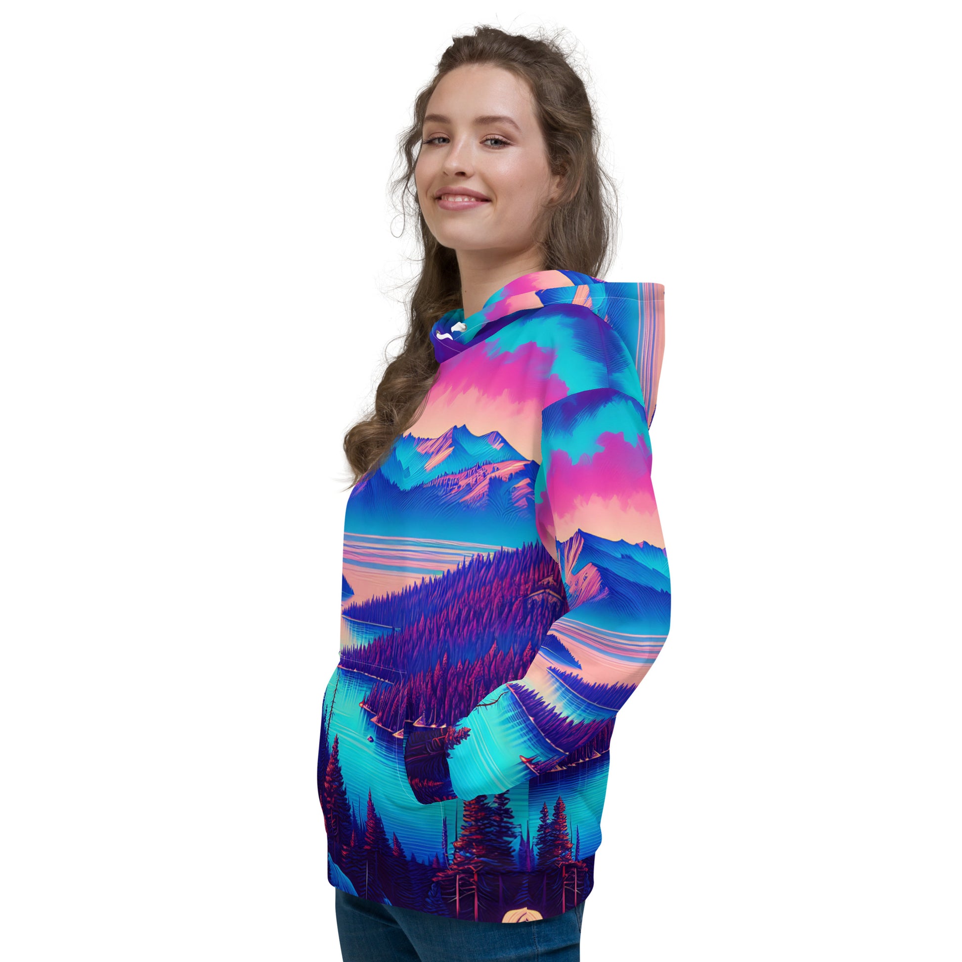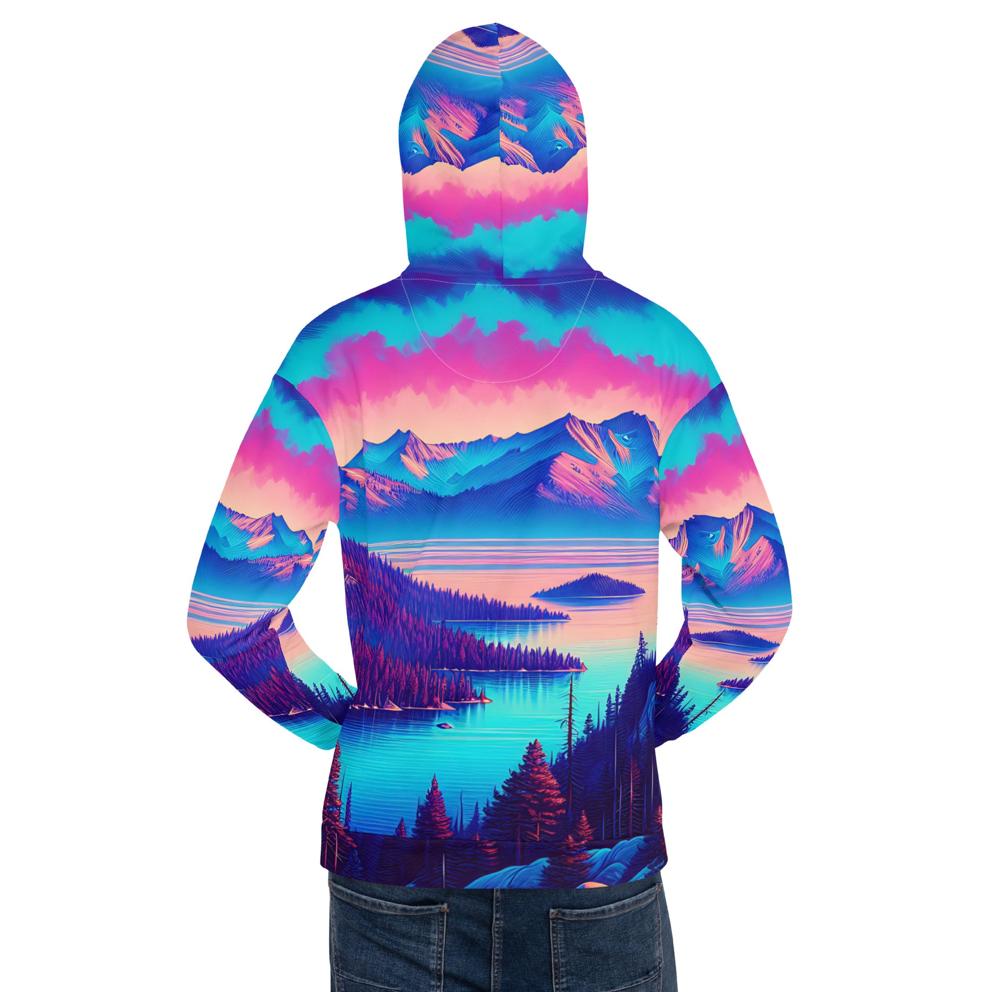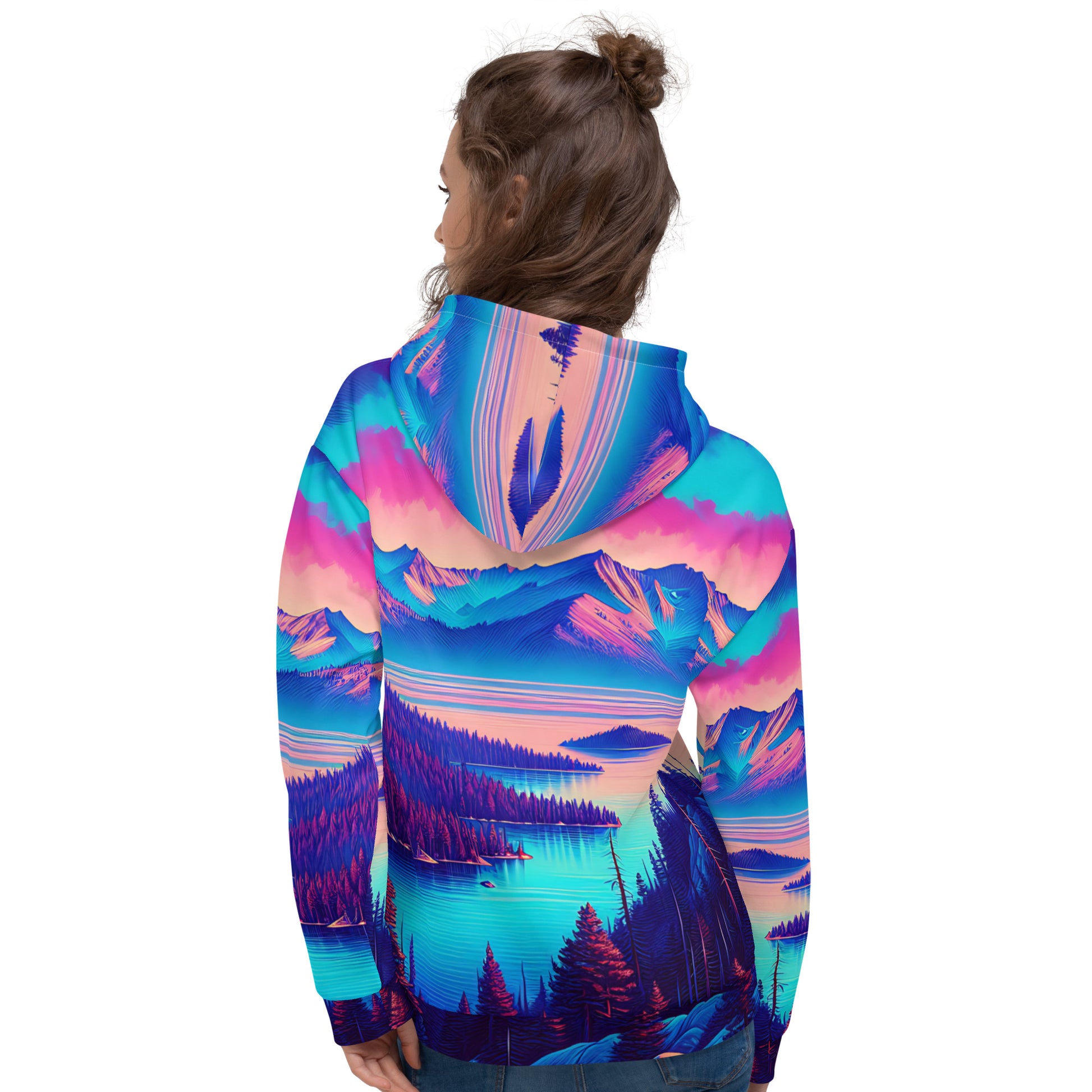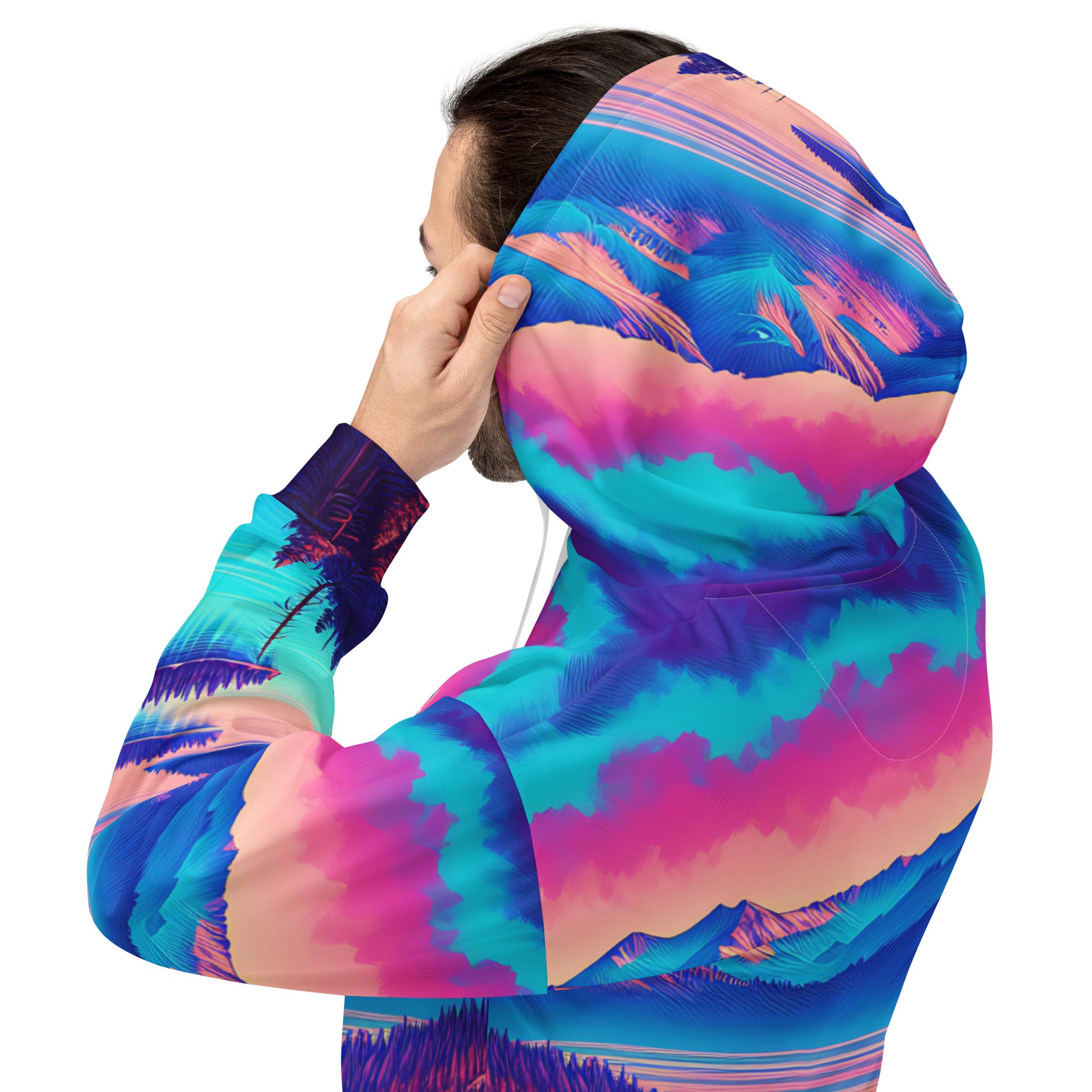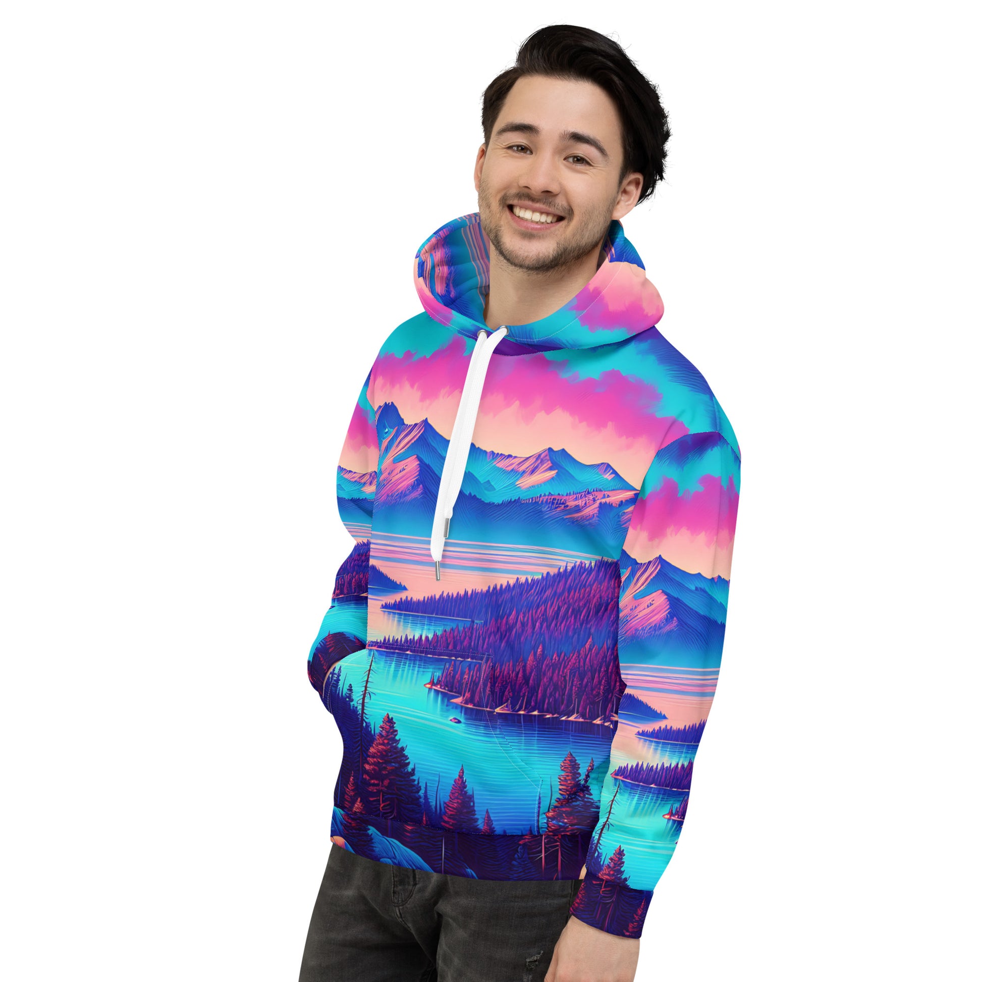 Experience a sartorial escape with this vibrant, mountain landscape graphic hoodie in size Large. The all-over print captures the ethereal beauty of a mountain sunset, with its vivid color palette of pink, blue, and purple hues. This unisex hoodie is as functional as it is visually striking, featuring a cozy drawstring hood and a convenient kangaroo pocket. The soft, durable fabric ensures comfort for all-day wear while making a bold fashion statement. Whether you're out on a casual stroll or looking to bring some artistic flair to your wardrobe, this hoodie is sure to turn heads and elevate your style game.