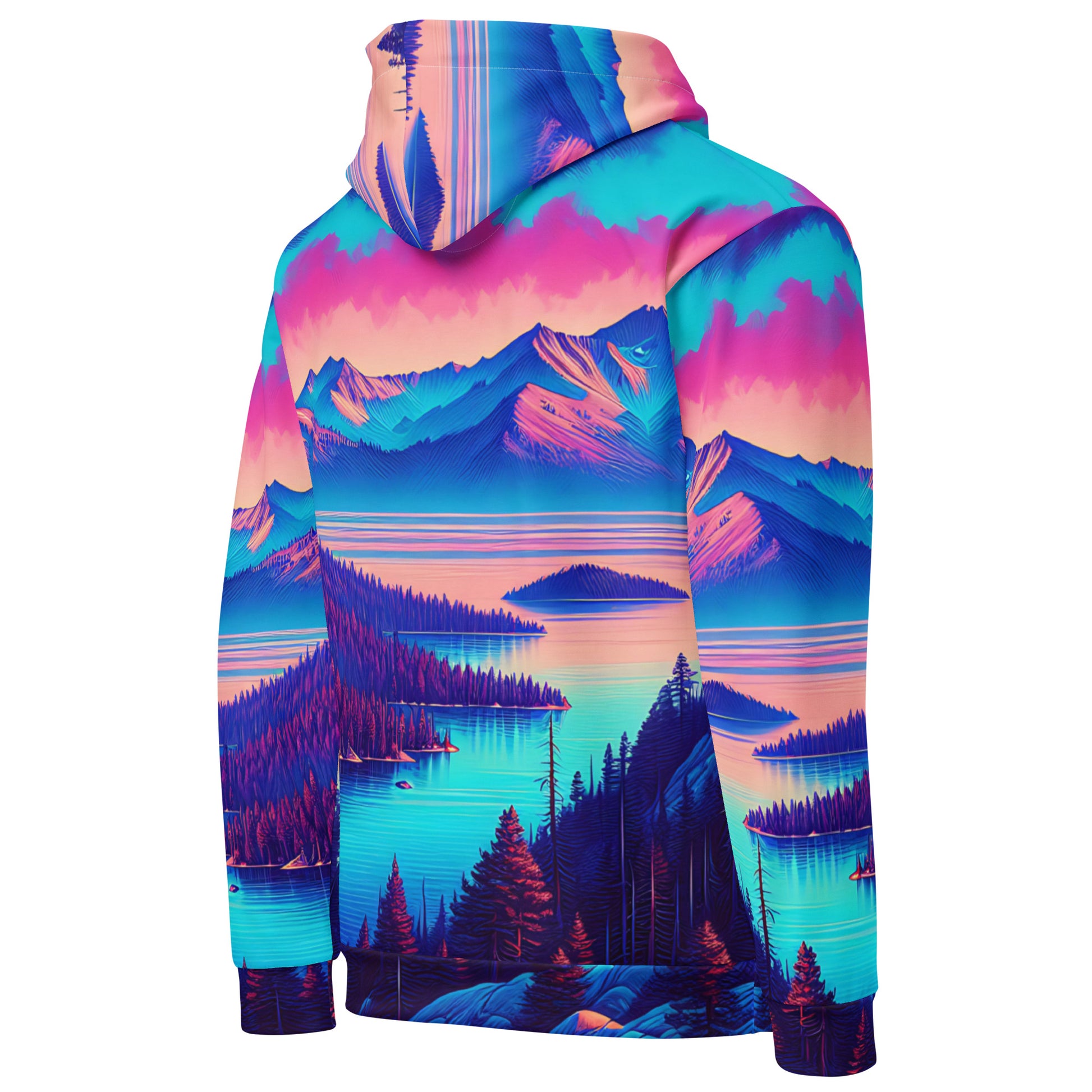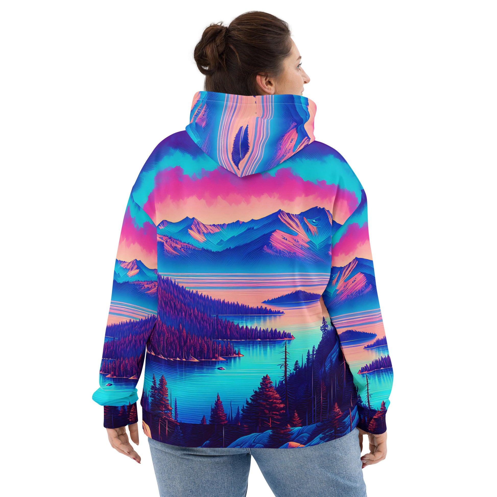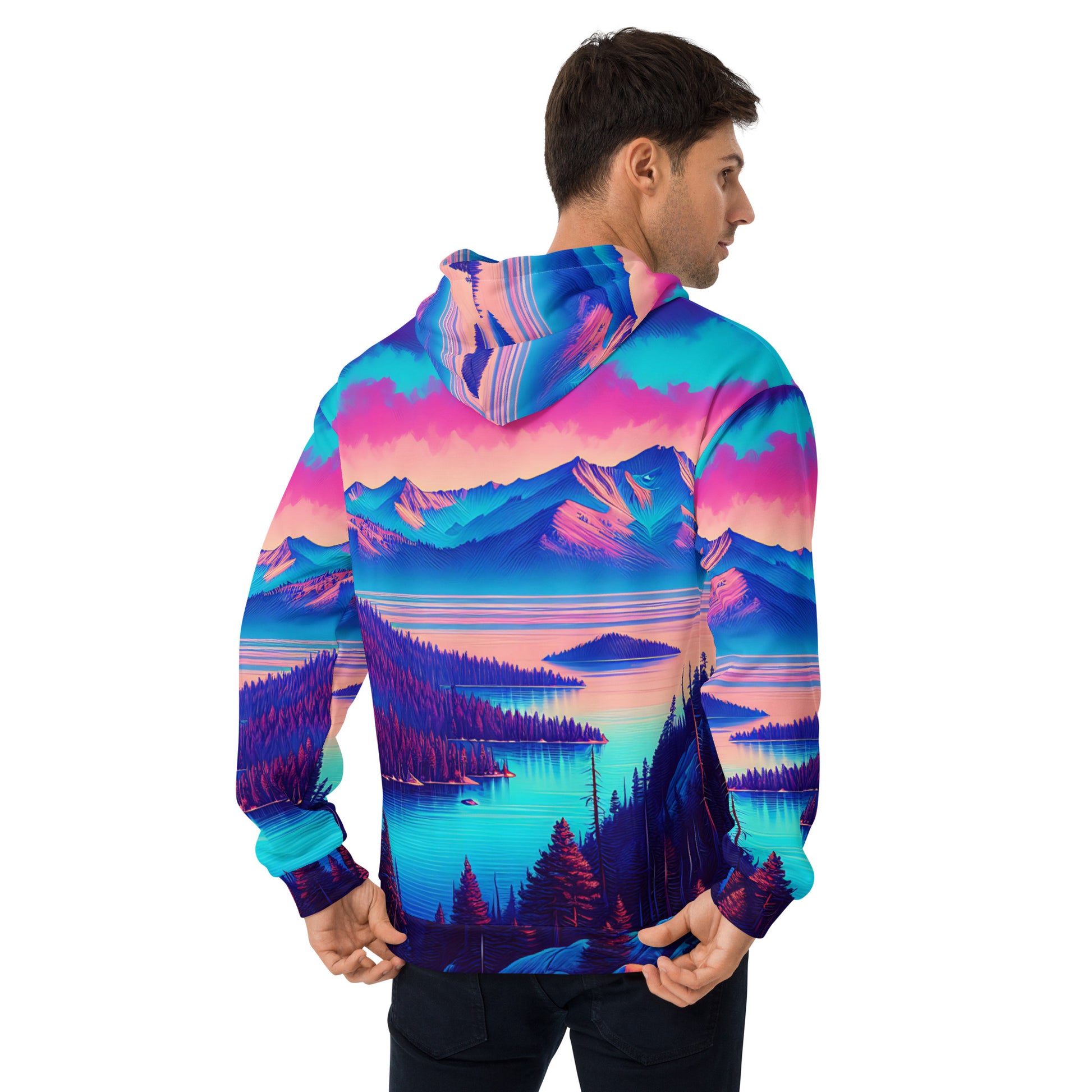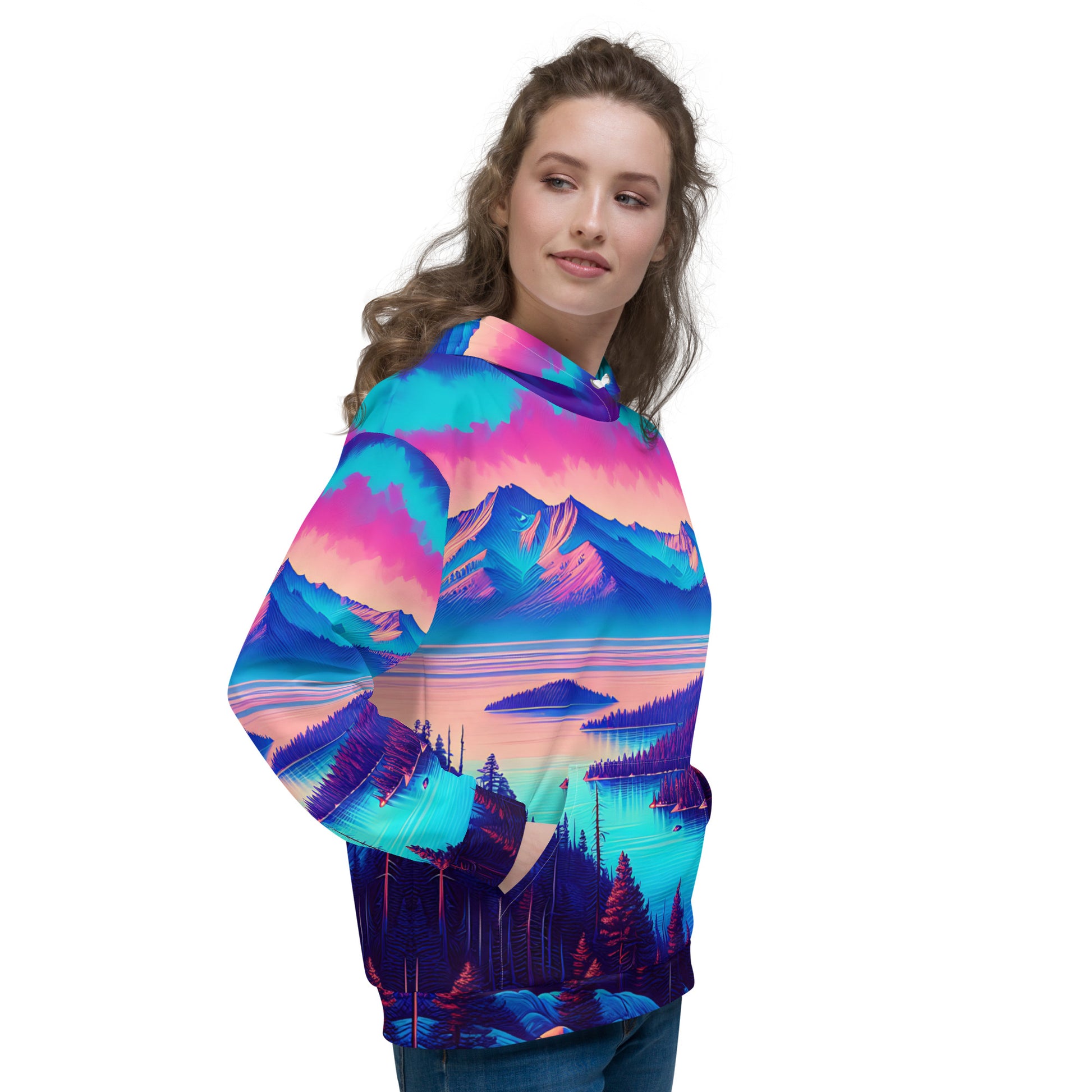 Experience a sartorial escape with this vibrant, mountain landscape graphic hoodie in size Large. The all-over print captures the ethereal beauty of a mountain sunset, with its vivid color palette of pink, blue, and purple hues. This unisex hoodie is as functional as it is visually striking, featuring a cozy drawstring hood and a convenient kangaroo pocket. The soft, durable fabric ensures comfort for all-day wear while making a bold fashion statement. Whether you're out on a casual stroll or looking to bring some artistic flair to your wardrobe, this hoodie is sure to turn heads and elevate your style game.