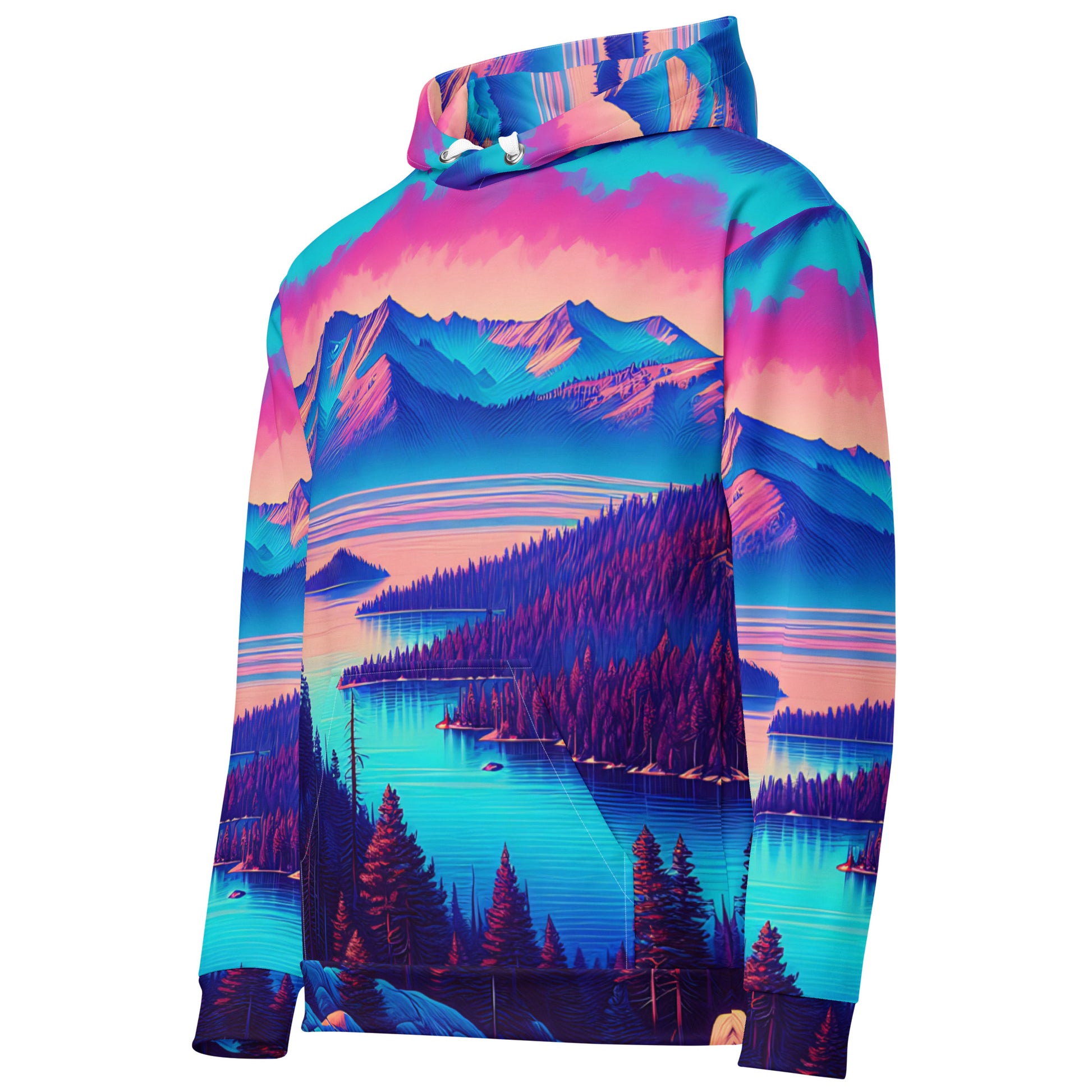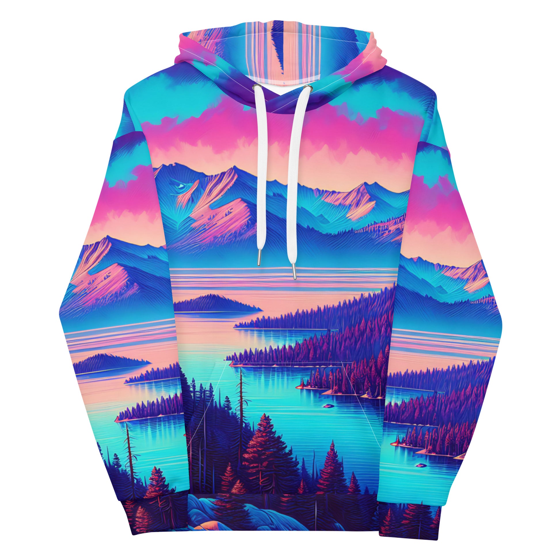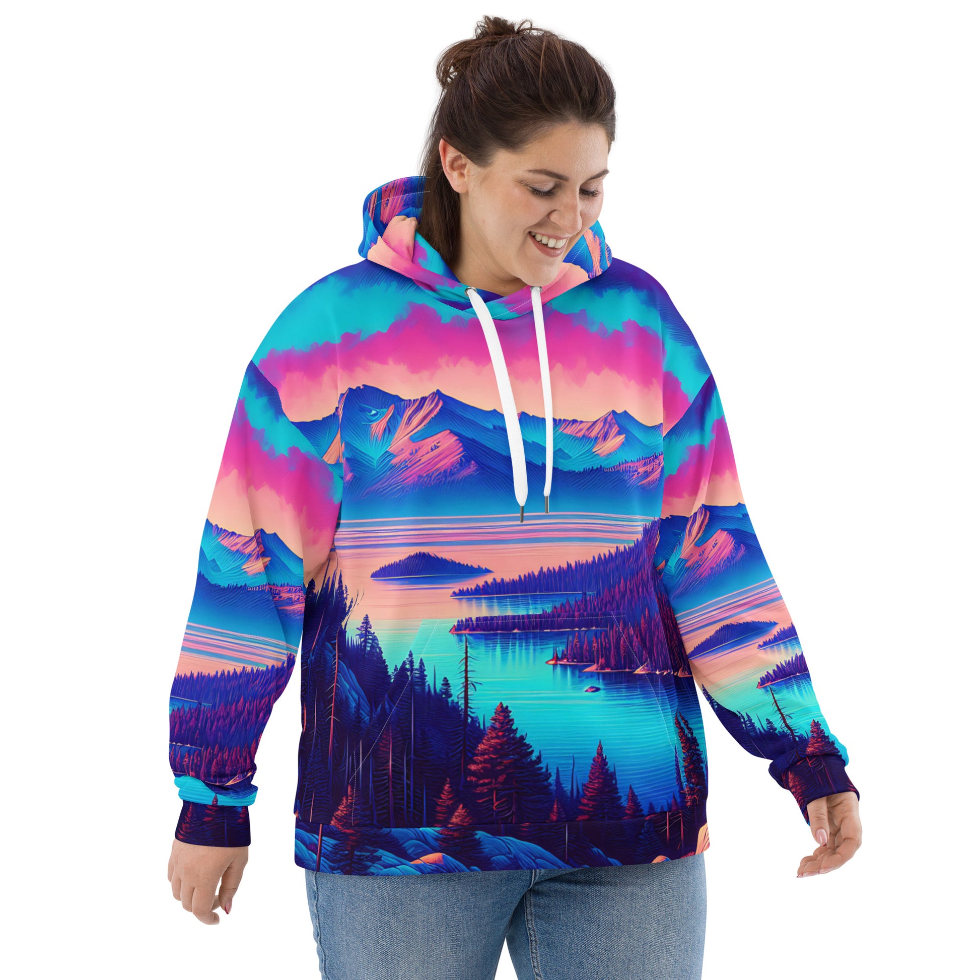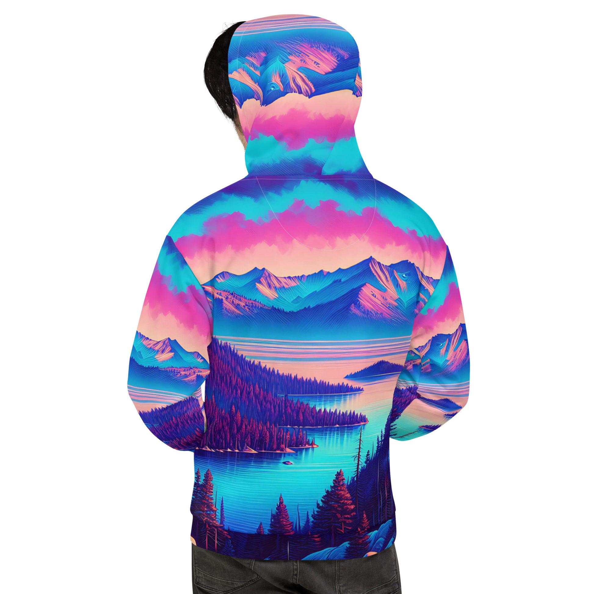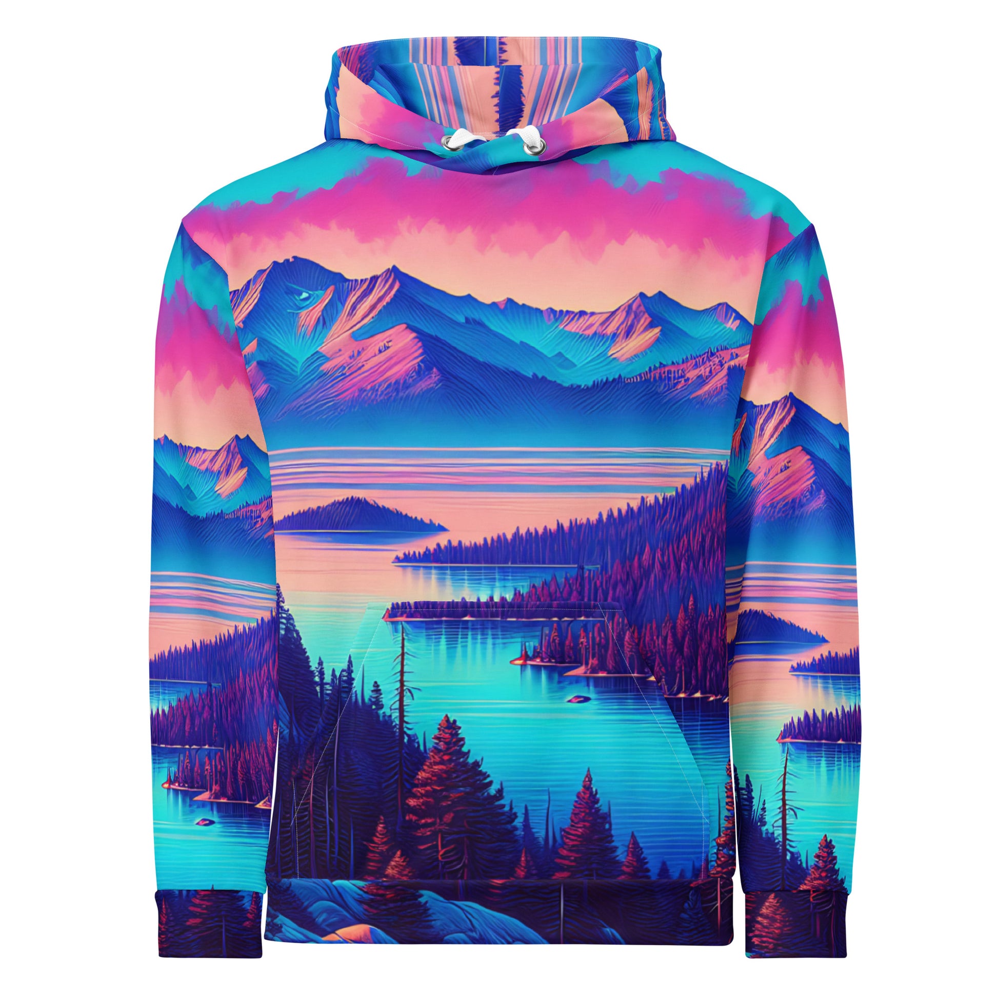 Experience a sartorial escape with this vibrant, mountain landscape graphic hoodie in size Large. The all-over print captures the ethereal beauty of a mountain sunset, with its vivid color palette of pink, blue, and purple hues. This unisex hoodie is as functional as it is visually striking, featuring a cozy drawstring hood and a convenient kangaroo pocket. The soft, durable fabric ensures comfort for all-day wear while making a bold fashion statement. Whether you're out on a casual stroll or looking to bring some artistic flair to your wardrobe, this hoodie is sure to turn heads and elevate your style game.