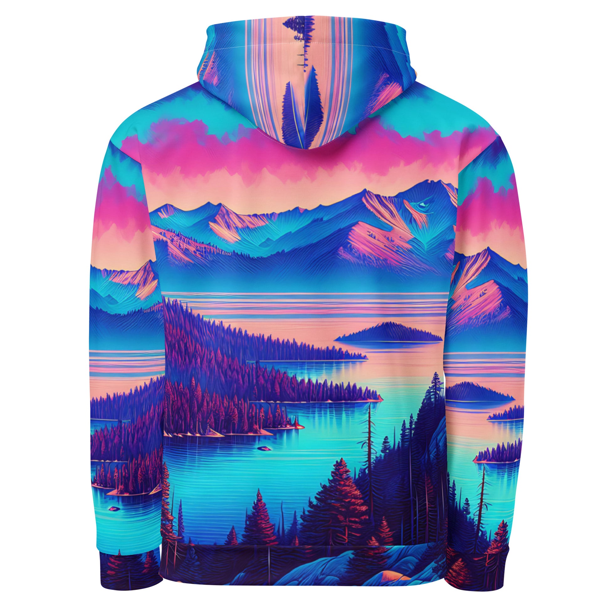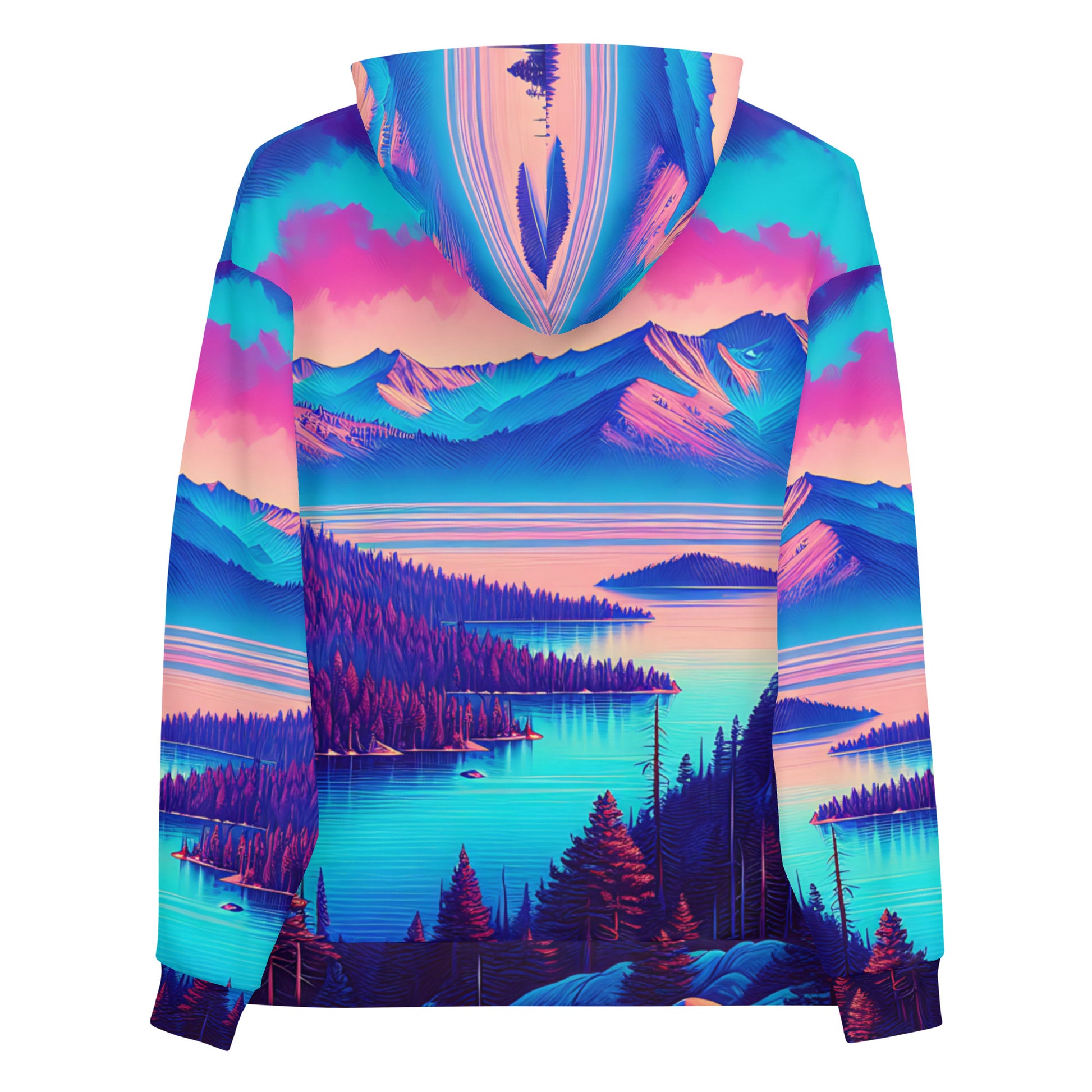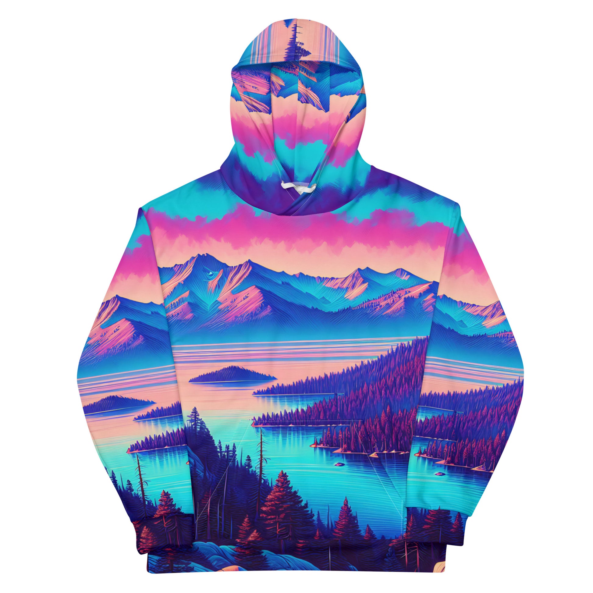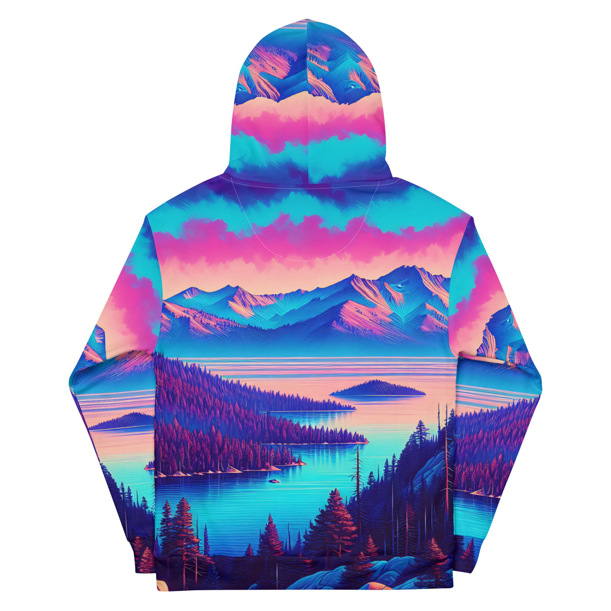 Experience a sartorial escape with this vibrant, mountain landscape graphic hoodie in size Large. The all-over print captures the ethereal beauty of a mountain sunset, with its vivid color palette of pink, blue, and purple hues. This unisex hoodie is as functional as it is visually striking, featuring a cozy drawstring hood and a convenient kangaroo pocket. The soft, durable fabric ensures comfort for all-day wear while making a bold fashion statement. Whether you're out on a casual stroll or looking to bring some artistic flair to your wardrobe, this hoodie is sure to turn heads and elevate your style game.