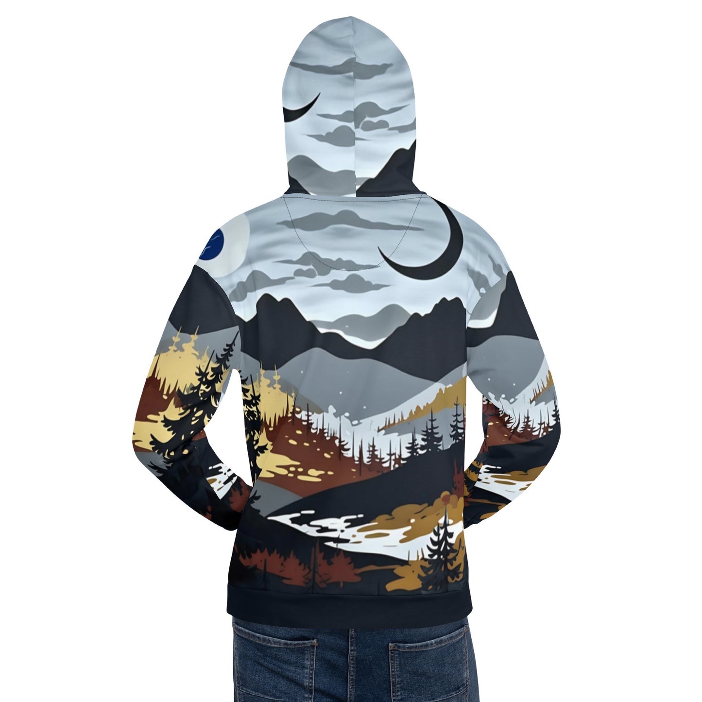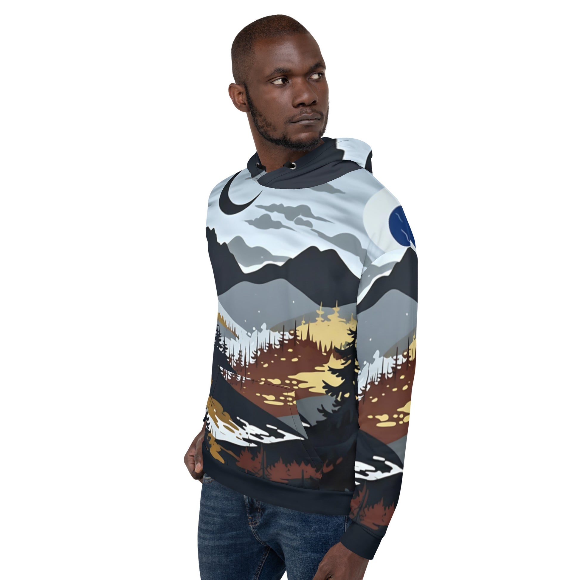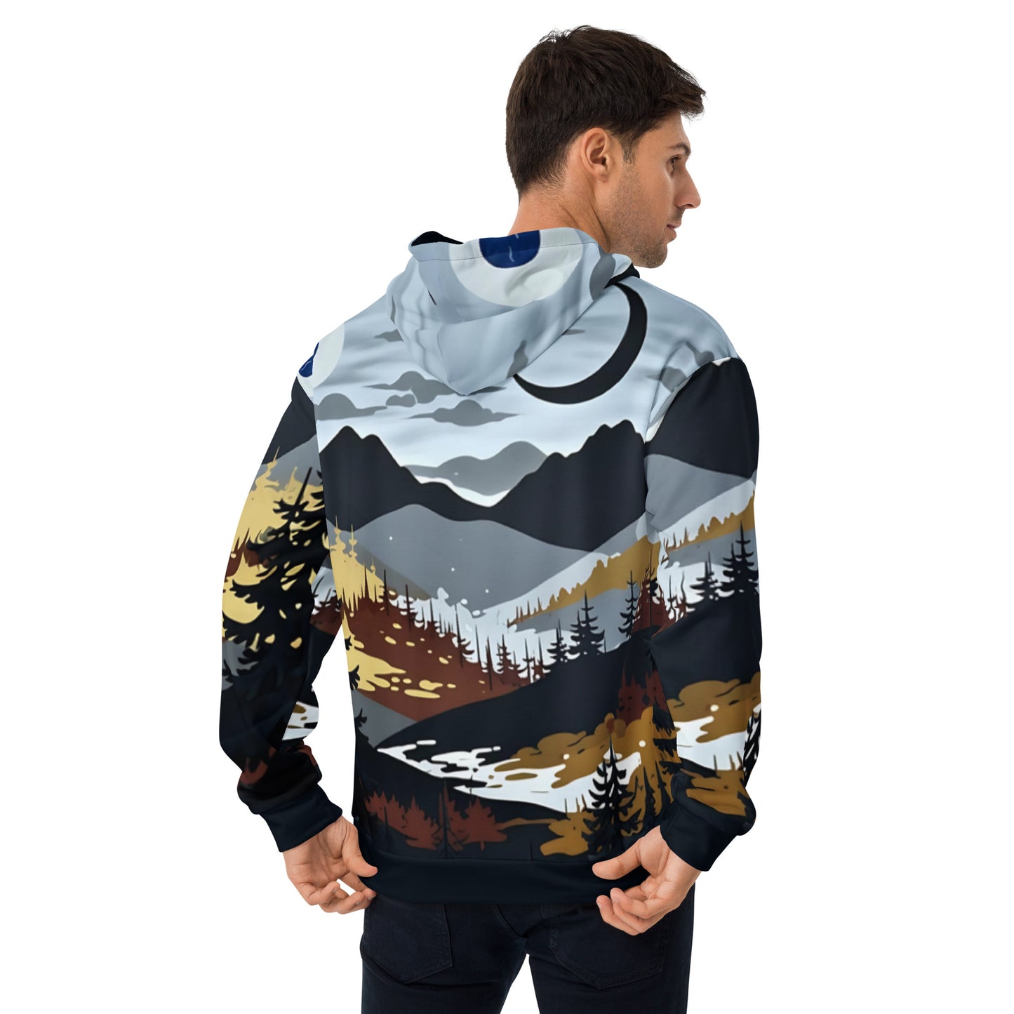 Stand out with this bold Mountain Nightscape Hoodie, designed with a vivid all-over print featuring stunning mountain landscapes, a crescent moon, and serene forest details. Perfect for casual wear, outdoor enthusiasts, and anyone who loves unique graphic styles, this pullover hoodie combines striking visuals with everyday comfort.