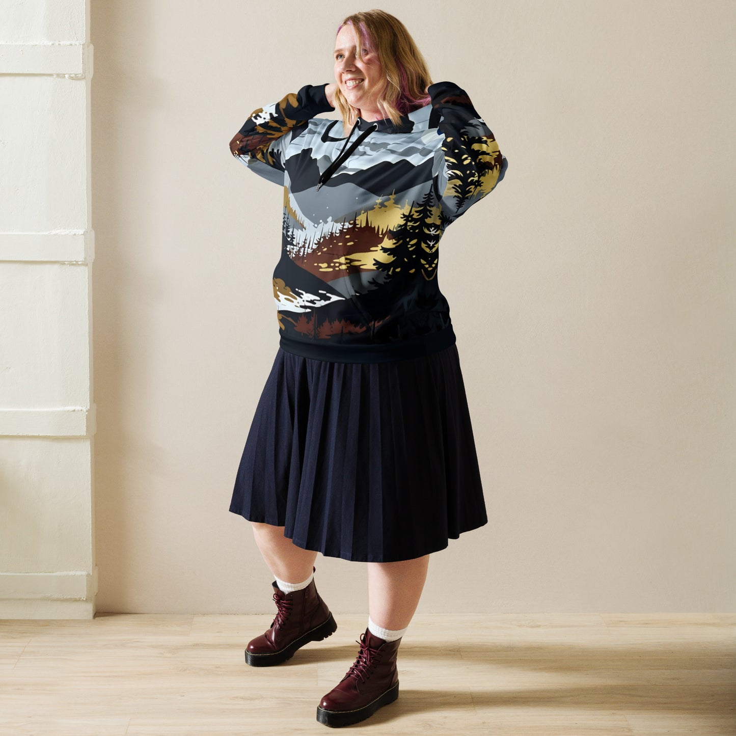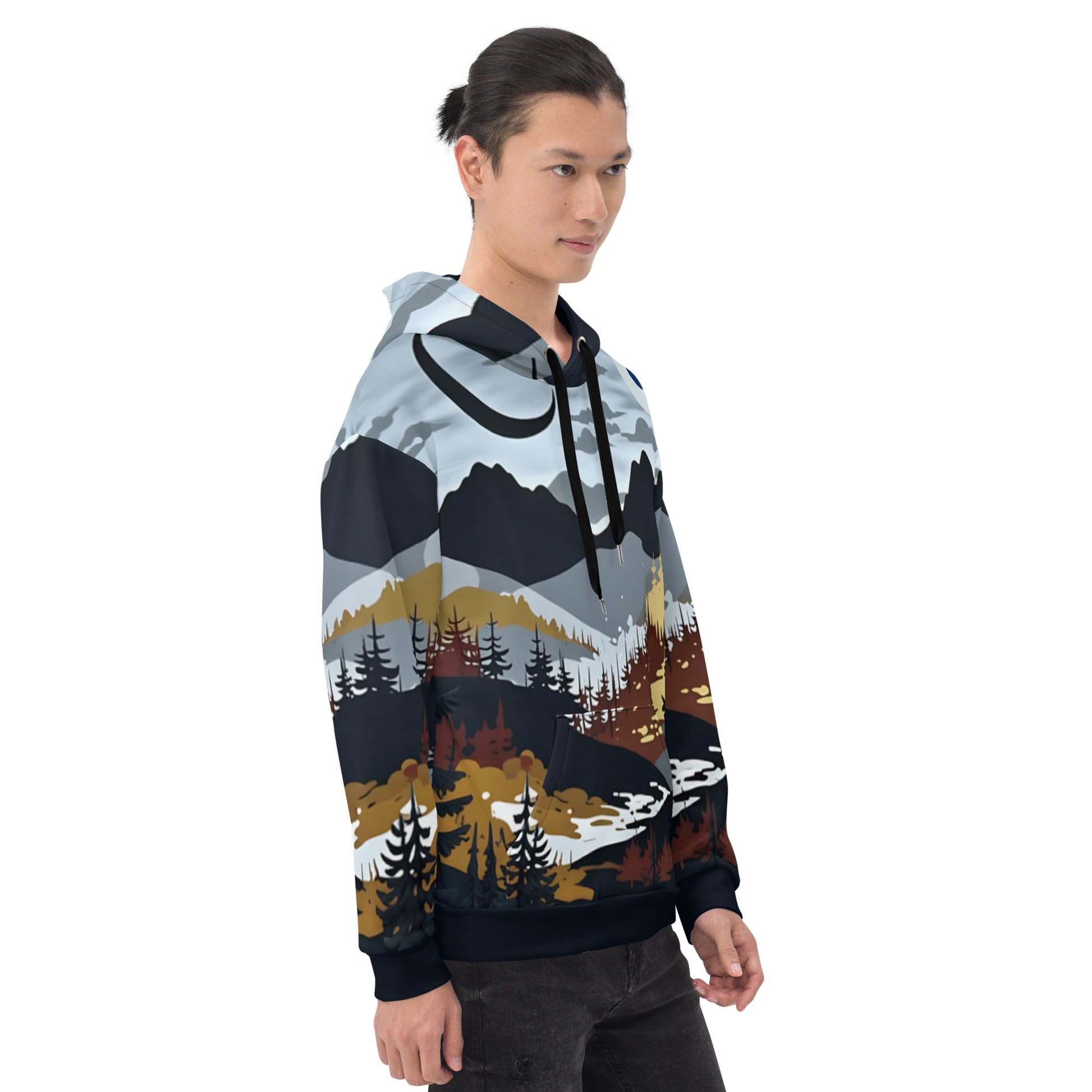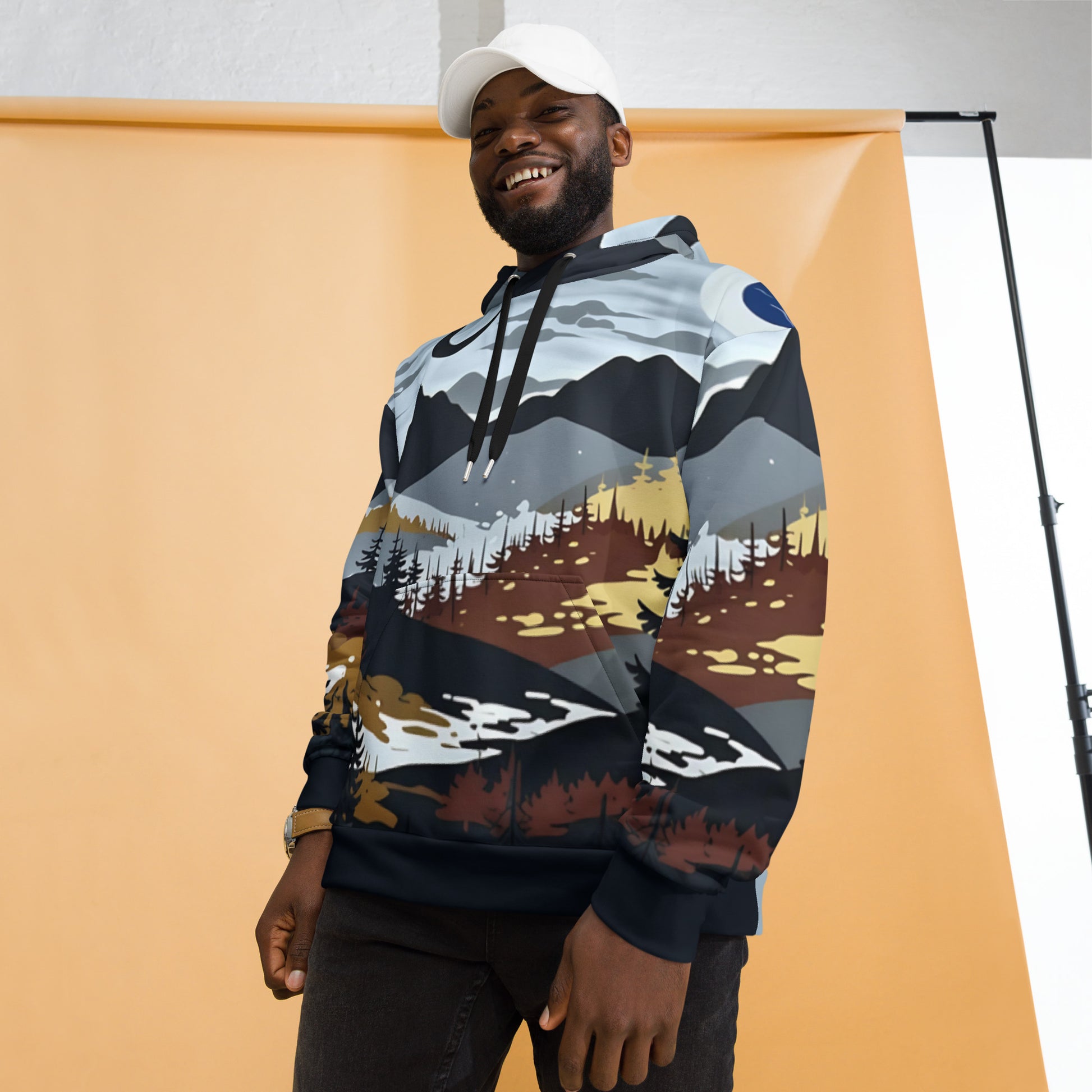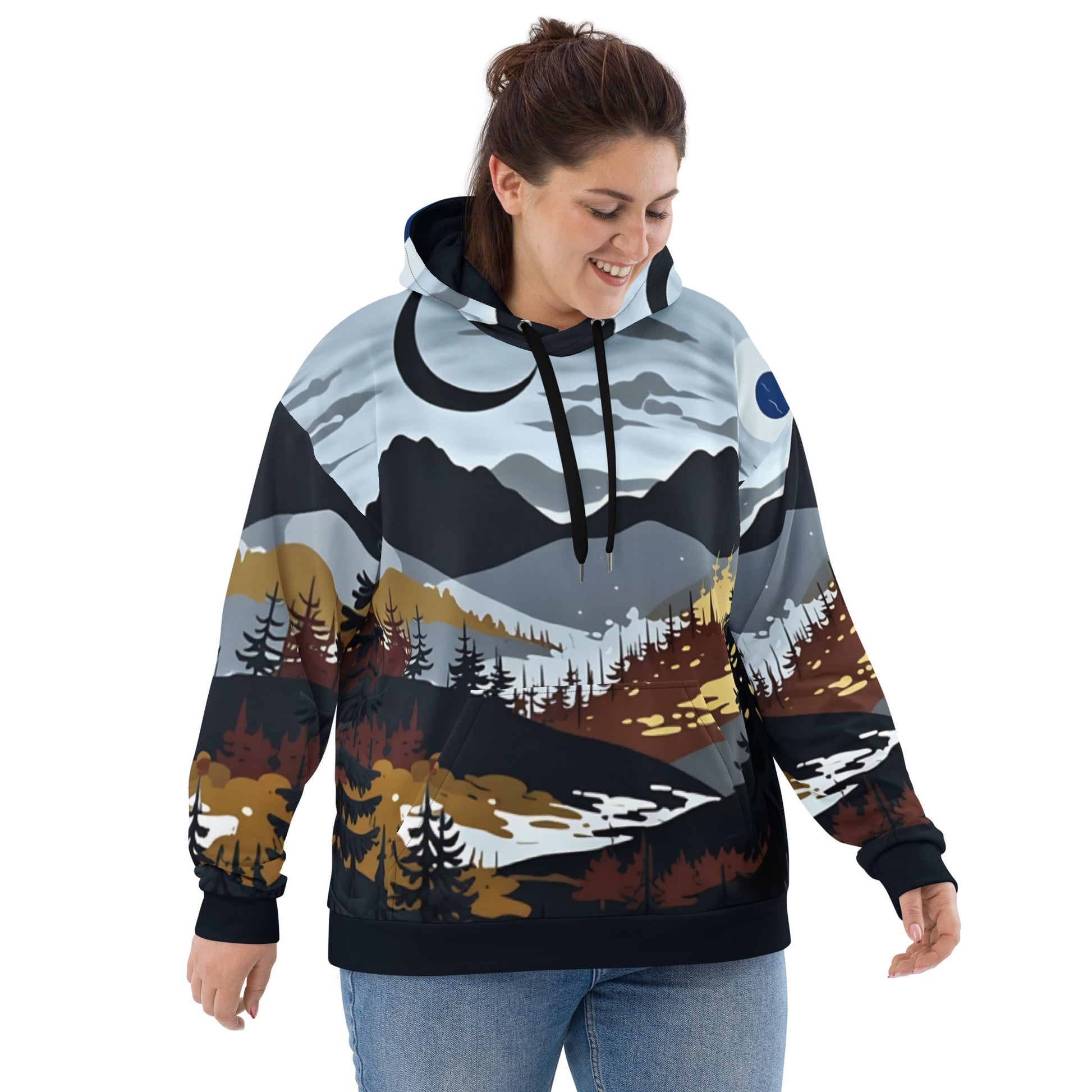Stand out with this bold Mountain Nightscape Hoodie, designed with a vivid all-over print featuring stunning mountain landscapes, a crescent moon, and serene forest details. Perfect for casual wear, outdoor enthusiasts, and anyone who loves unique graphic styles, this pullover hoodie combines striking visuals with everyday comfort.