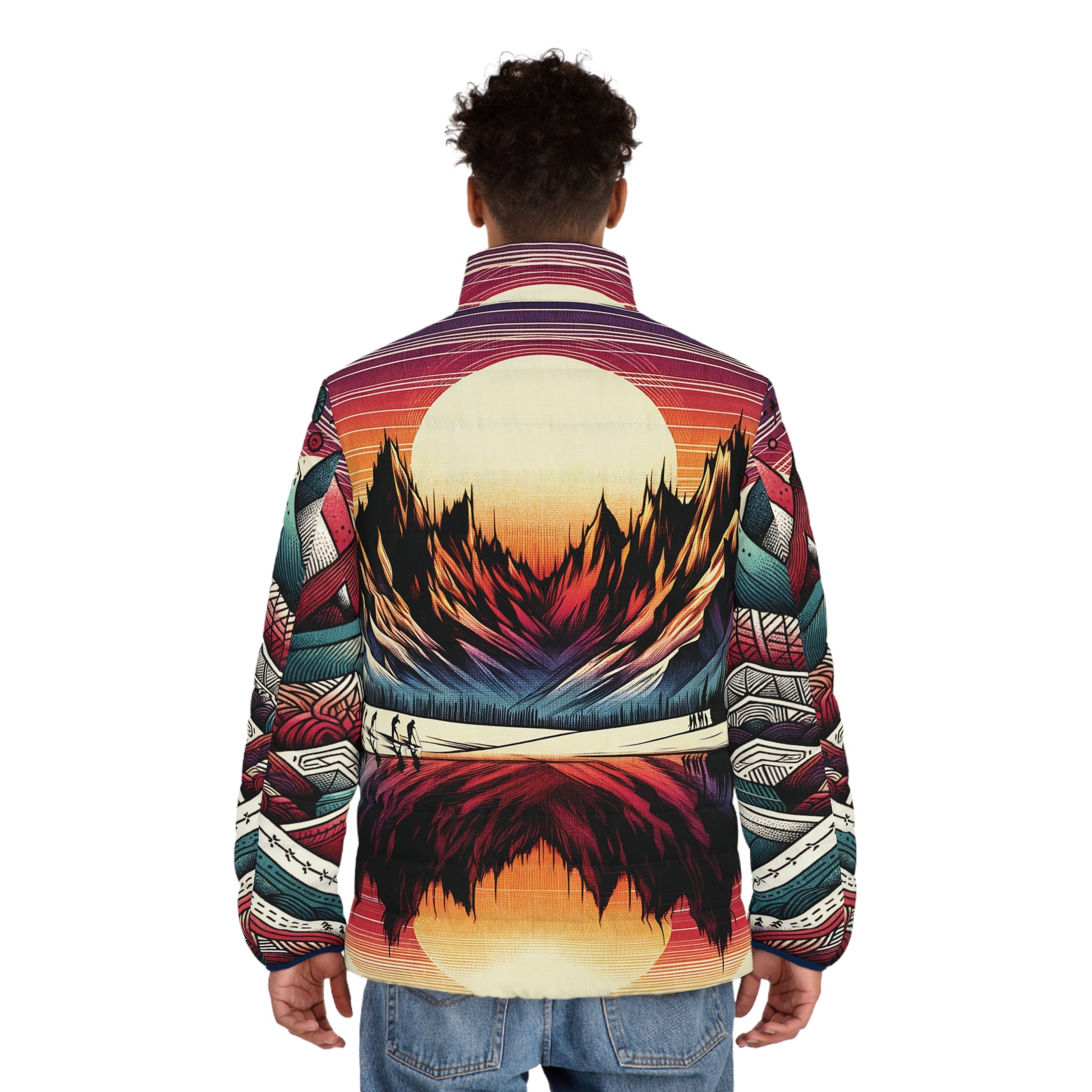 Stay cozy and stylish with this Mountain Sunset Puffer Jacket, featuring a striking all-over print of mountain sunsets and vibrant patterns. Lightweight yet warm, it’s perfect for skiing, hiking, camping, or casual wear in a mountain town. A perfect blend of function and fashion for outdoor enthusiasts!
