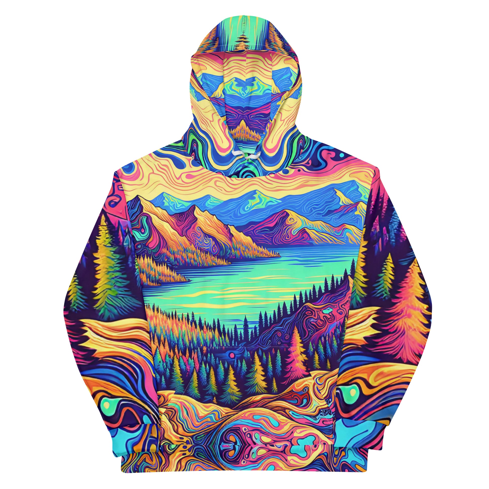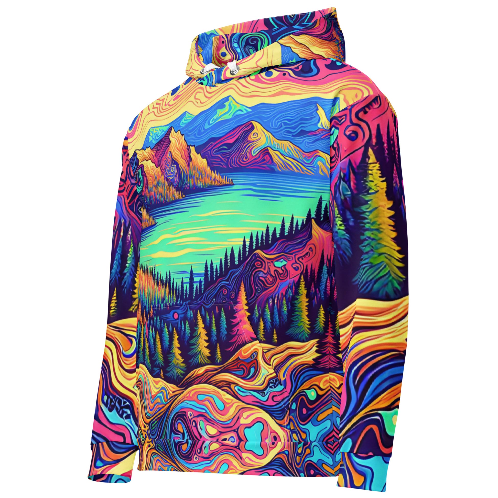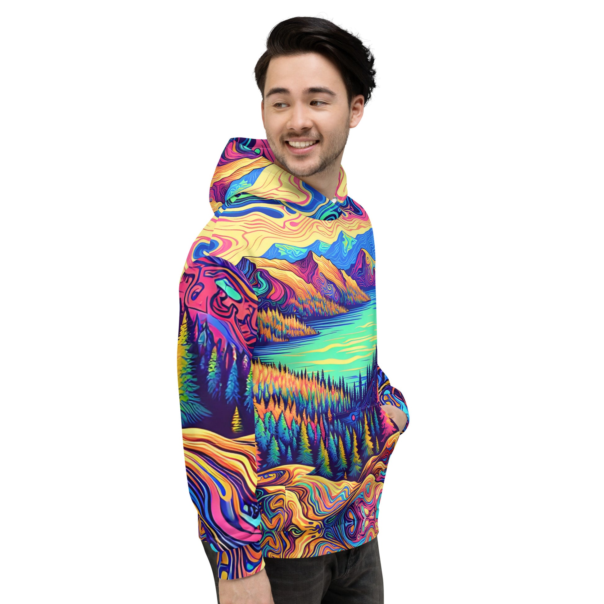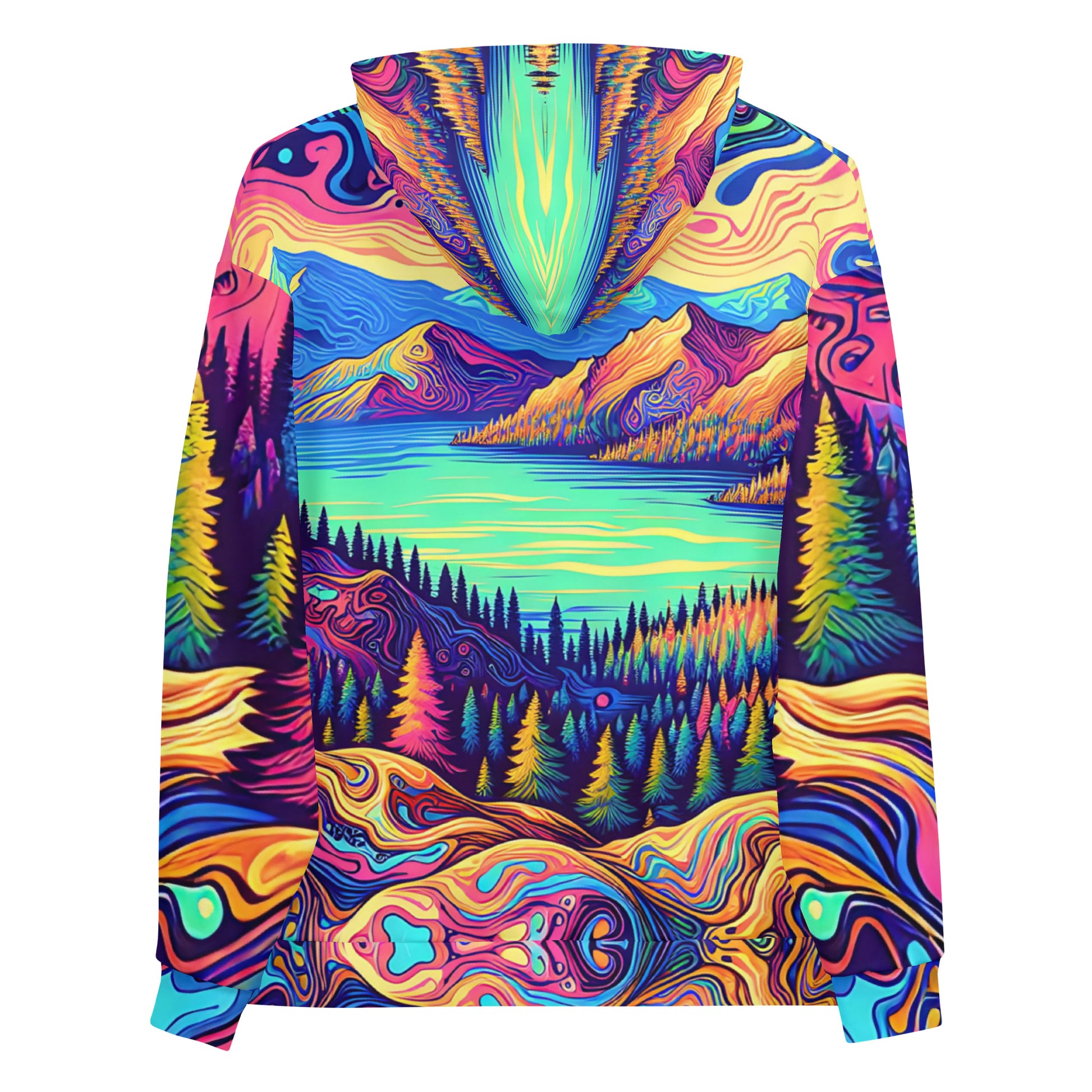 Immerse yourself in a vibrant dreamscape with this unisex psychedelic hoodie, size Medium. The all-over print features an exquisite water reflection of a forest landscape, blending rich, fluid colors in a mesmerizing pattern. Each sleeve boasts unique swirls resembling contour lines on a map, while the central motif is a serene lake view, flanked by lush, imaginary mountains. The hoodie's material offers comfort and durability, making it perfect for both outdoor adventures and casual outings. A spacious kangaroo pocket and an adjustable hood provide functionality without sacrificing style. Get ready to stand out in any crowd with this eye-catching piece of wearable art!