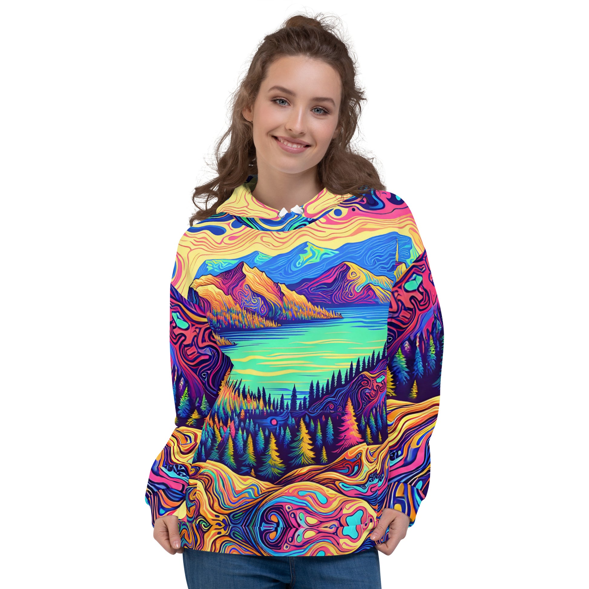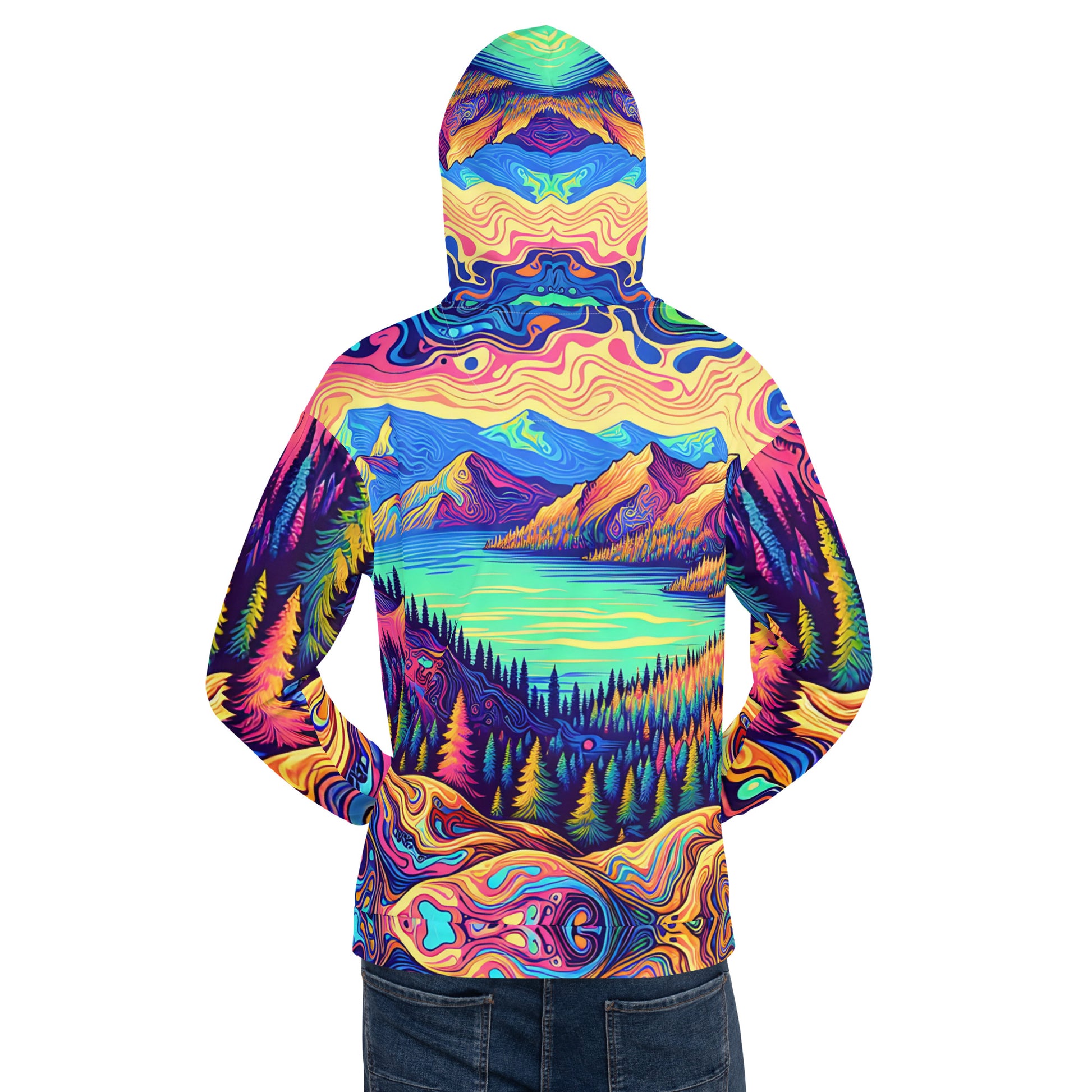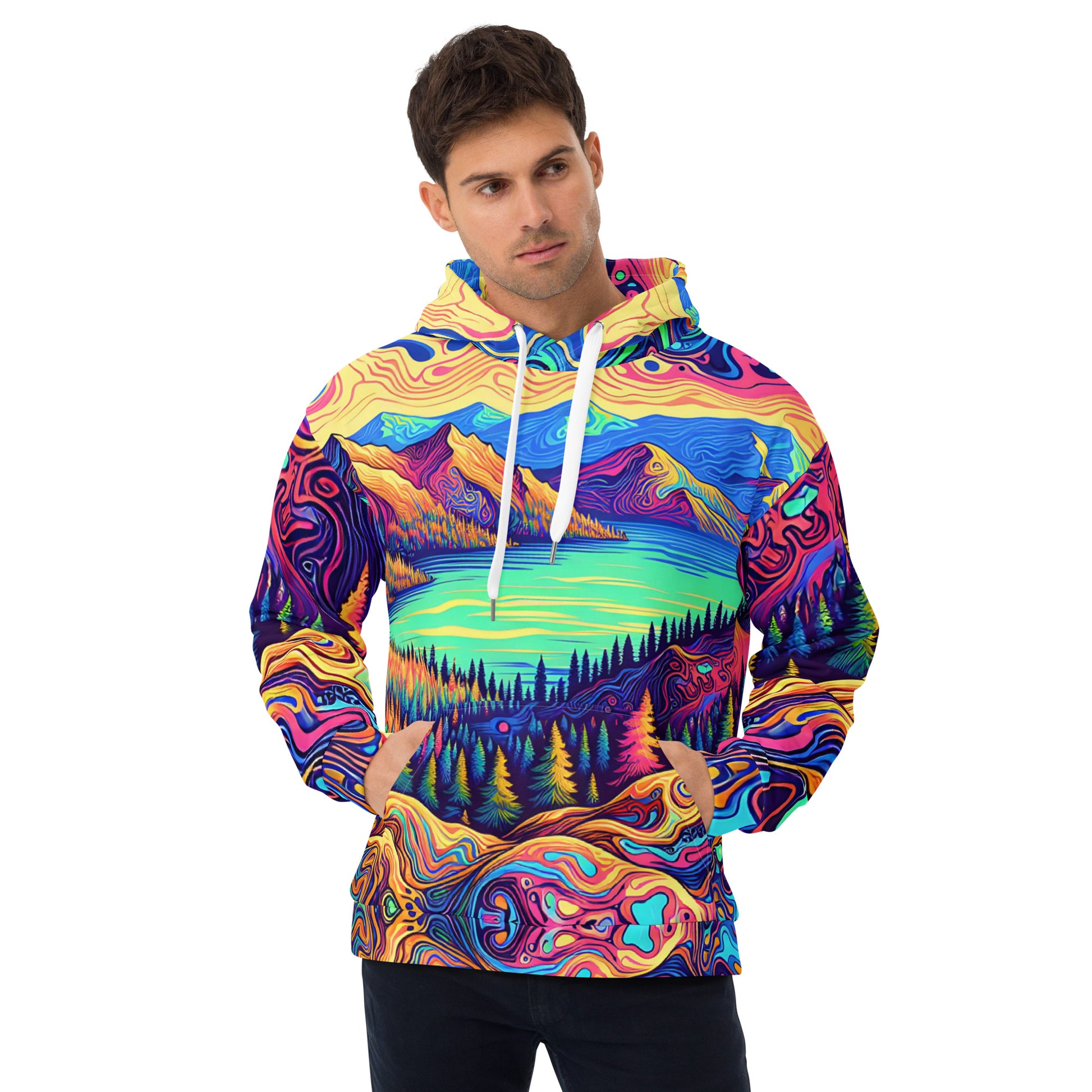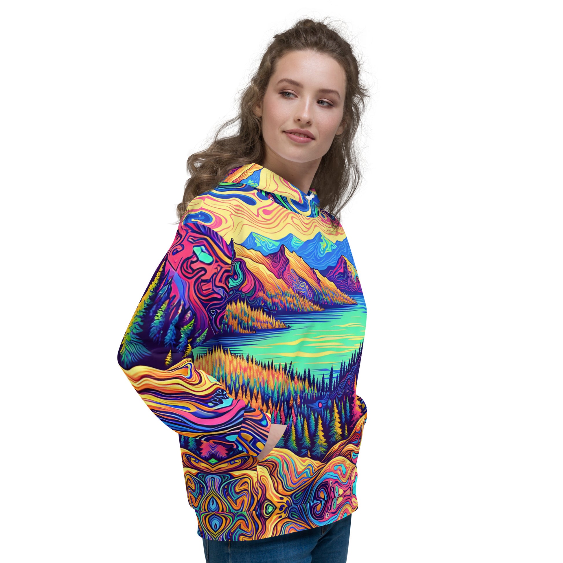 Immerse yourself in a vibrant dreamscape with this unisex psychedelic hoodie, size Medium. The all-over print features an exquisite water reflection of a forest landscape, blending rich, fluid colors in a mesmerizing pattern. Each sleeve boasts unique swirls resembling contour lines on a map, while the central motif is a serene lake view, flanked by lush, imaginary mountains. The hoodie's material offers comfort and durability, making it perfect for both outdoor adventures and casual outings. A spacious kangaroo pocket and an adjustable hood provide functionality without sacrificing style. Get ready to stand out in any crowd with this eye-catching piece of wearable art!