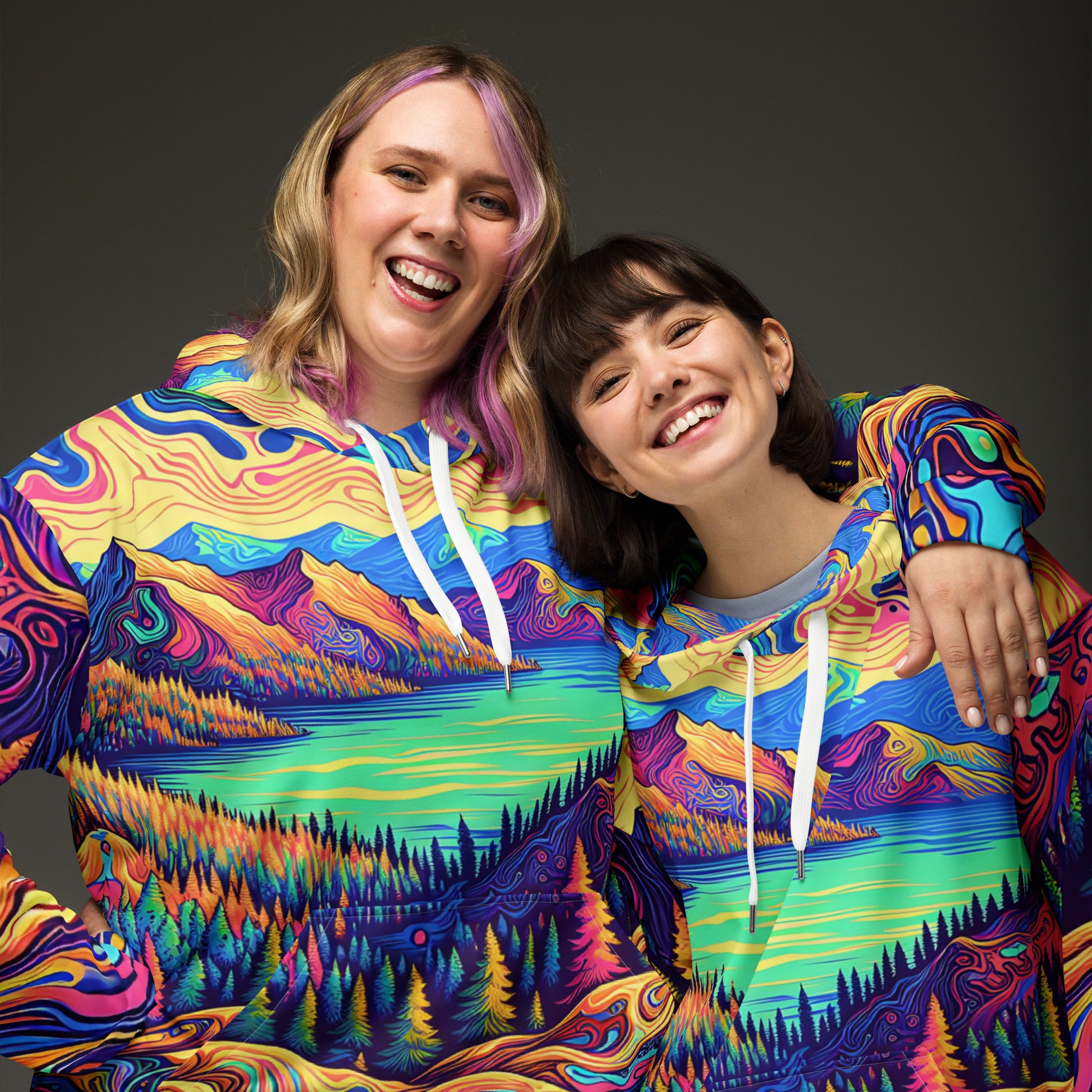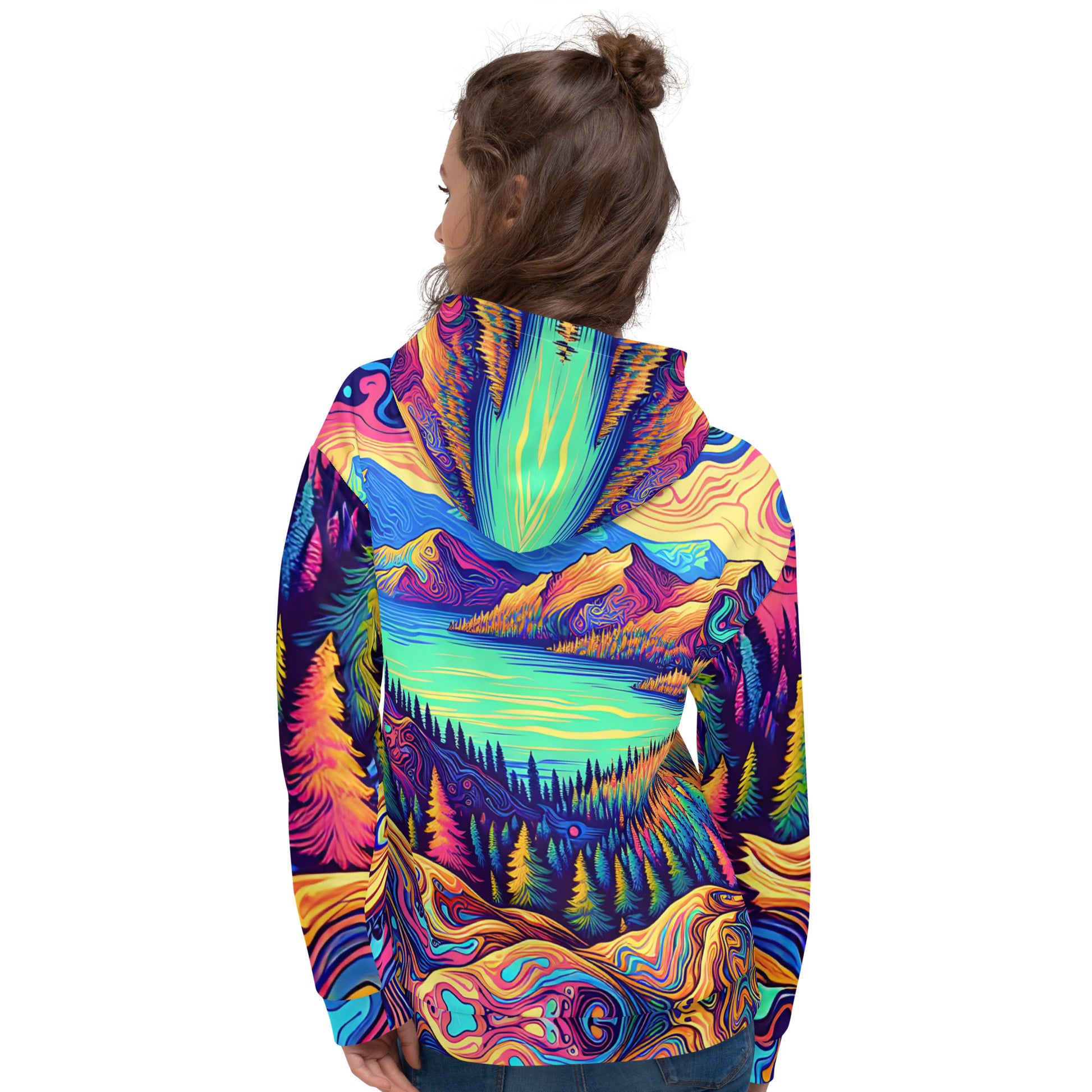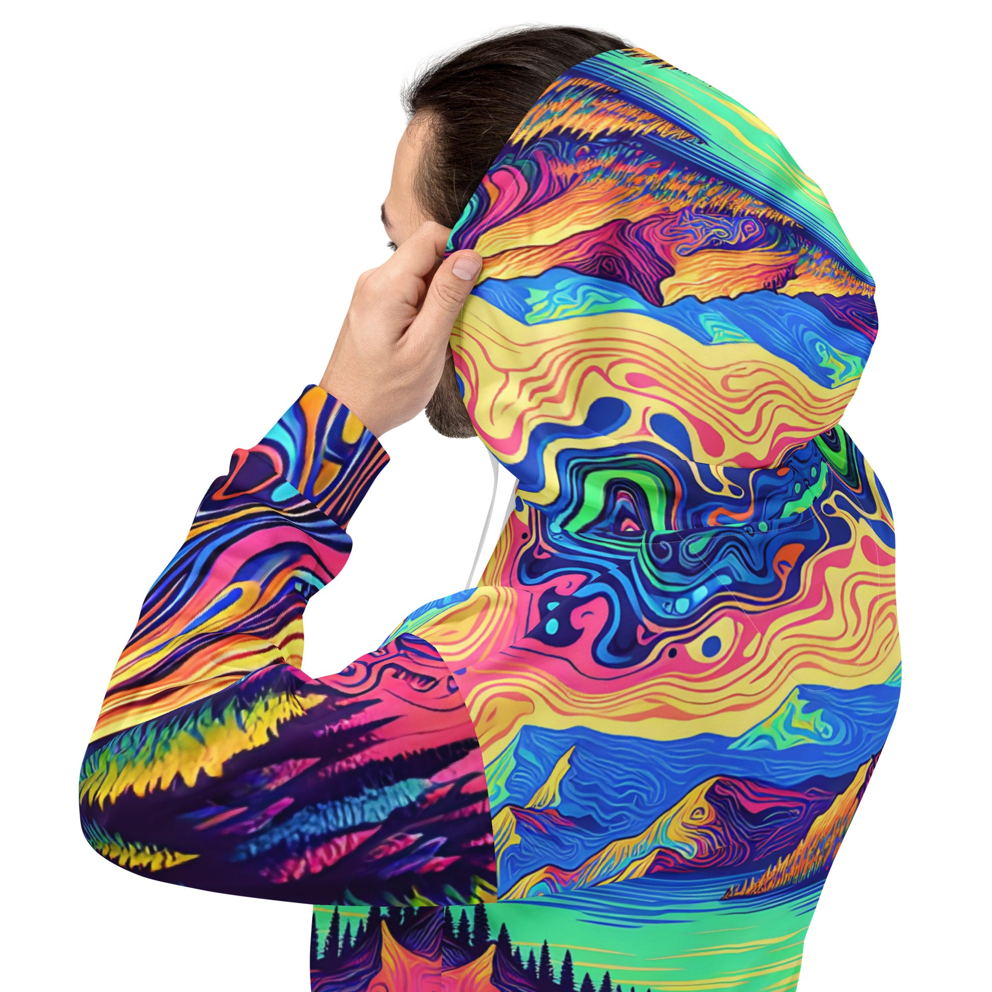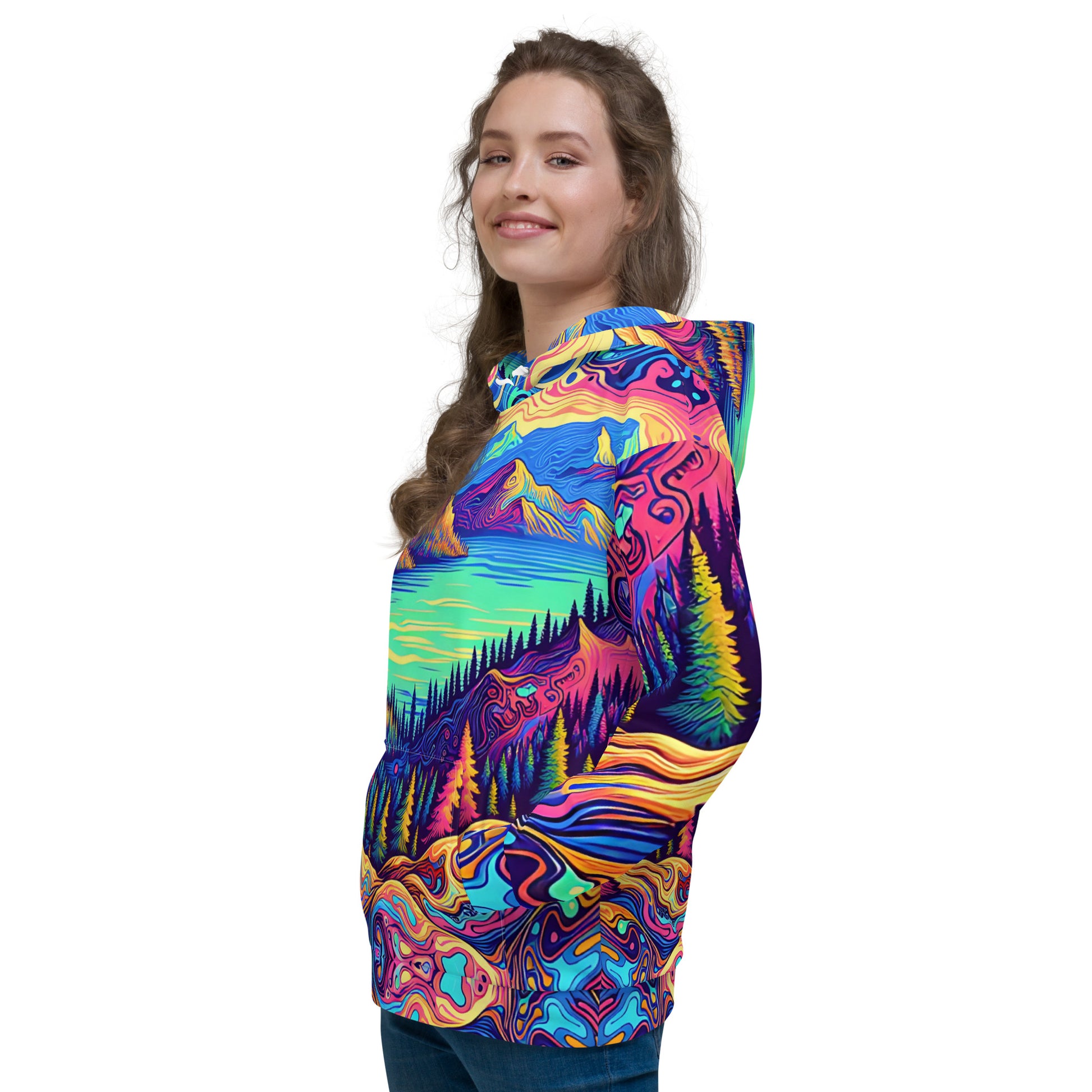 Immerse yourself in a vibrant dreamscape with this unisex psychedelic hoodie, size Medium. The all-over print features an exquisite water reflection of a forest landscape, blending rich, fluid colors in a mesmerizing pattern. Each sleeve boasts unique swirls resembling contour lines on a map, while the central motif is a serene lake view, flanked by lush, imaginary mountains. The hoodie's material offers comfort and durability, making it perfect for both outdoor adventures and casual outings. A spacious kangaroo pocket and an adjustable hood provide functionality without sacrificing style. Get ready to stand out in any crowd with this eye-catching piece of wearable art!