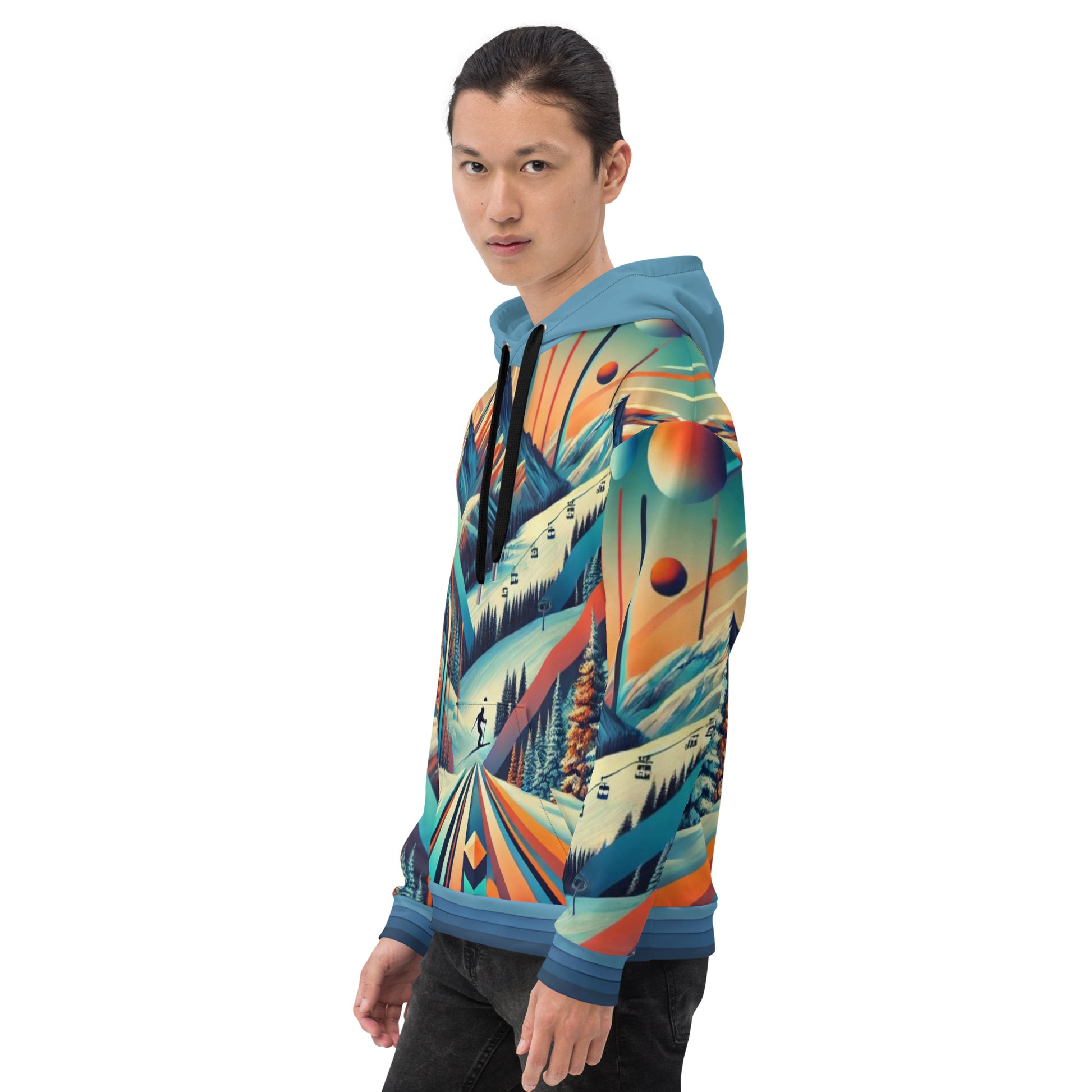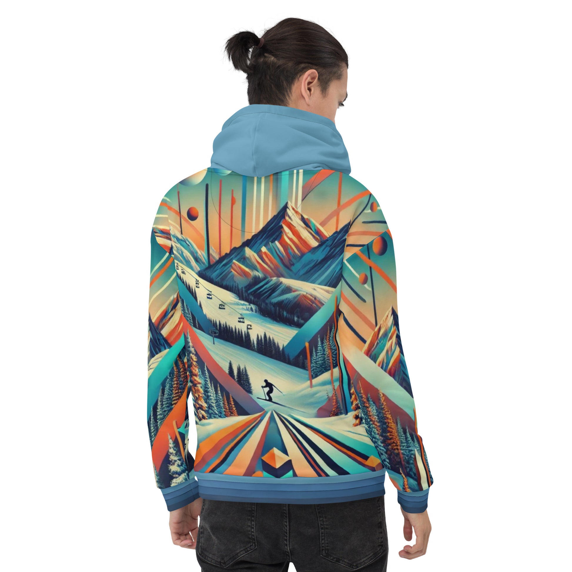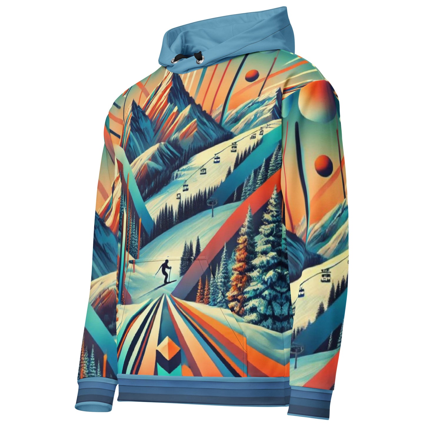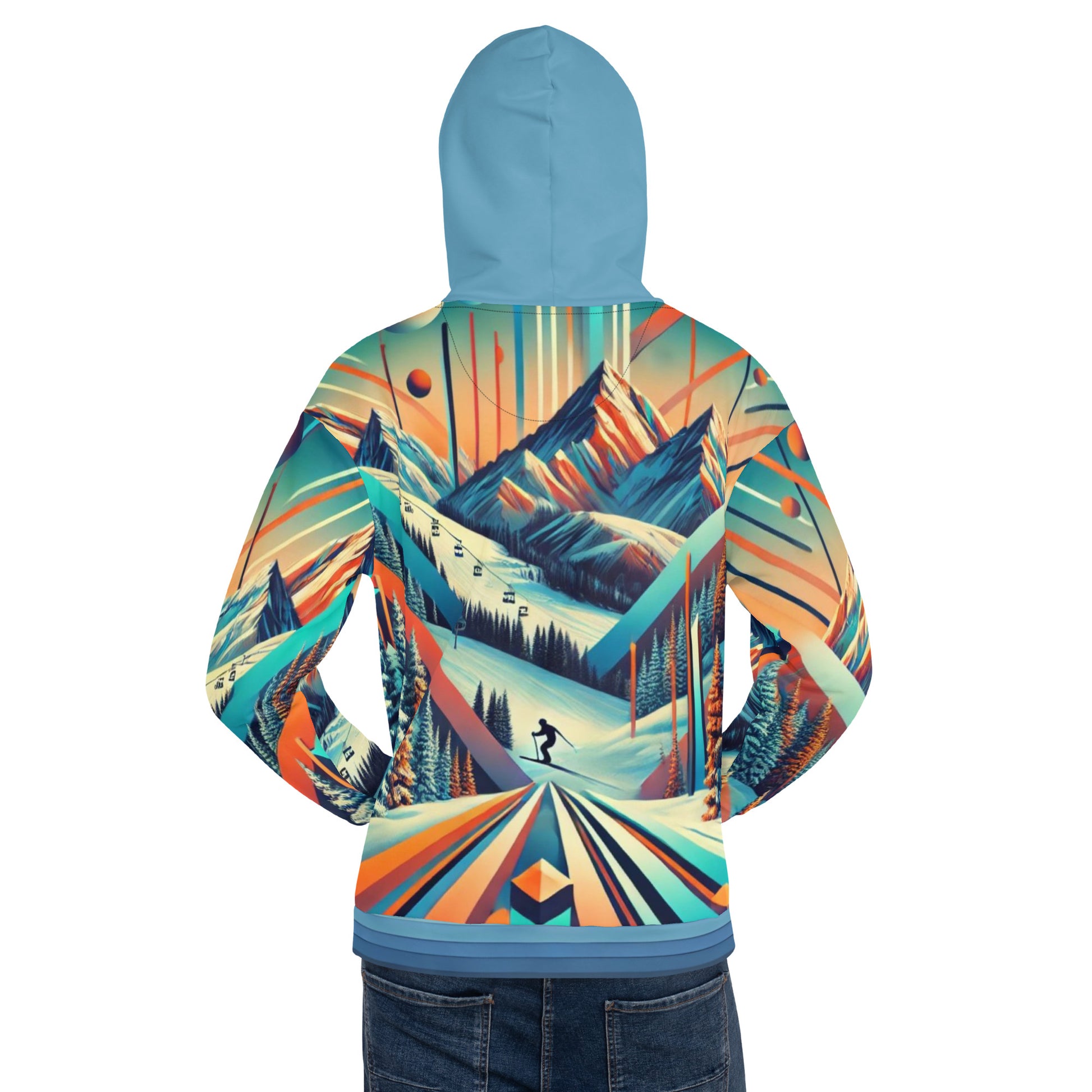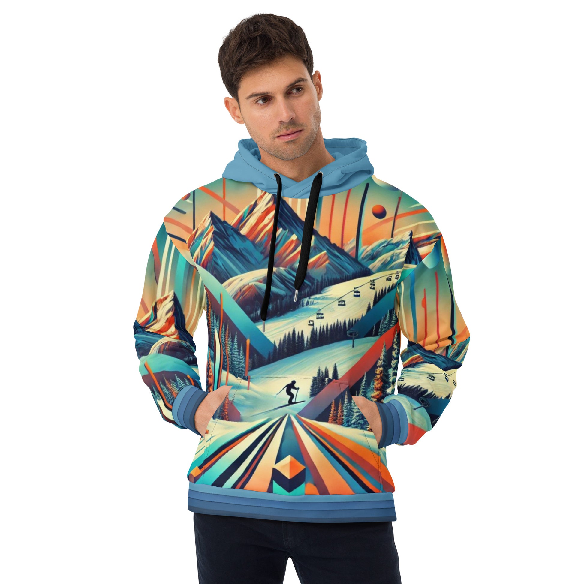 This adult pullover hoodie features a dynamic retro ski mountain design that’s perfect for casual wear or après-ski adventures. With its bold, multicolor print and cozy fabric, this hoodie is designed for those who love to stand out.